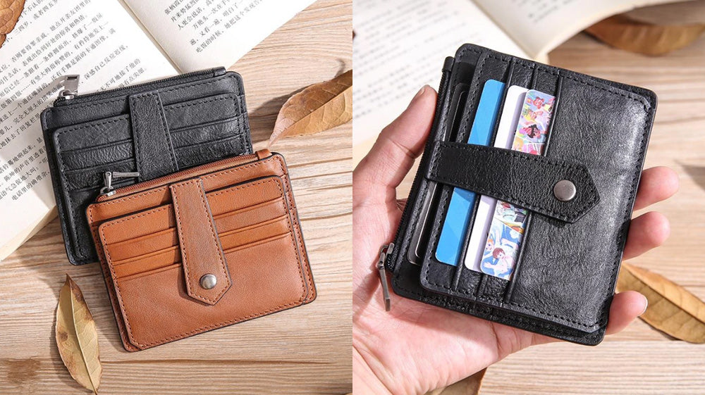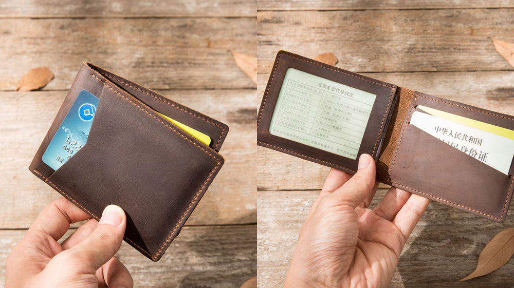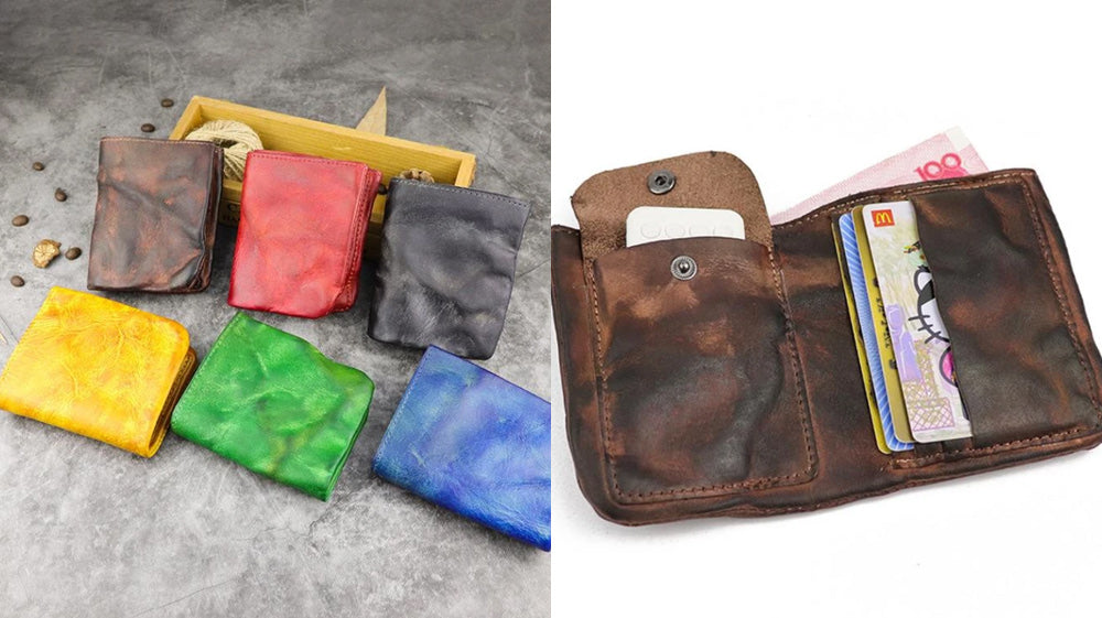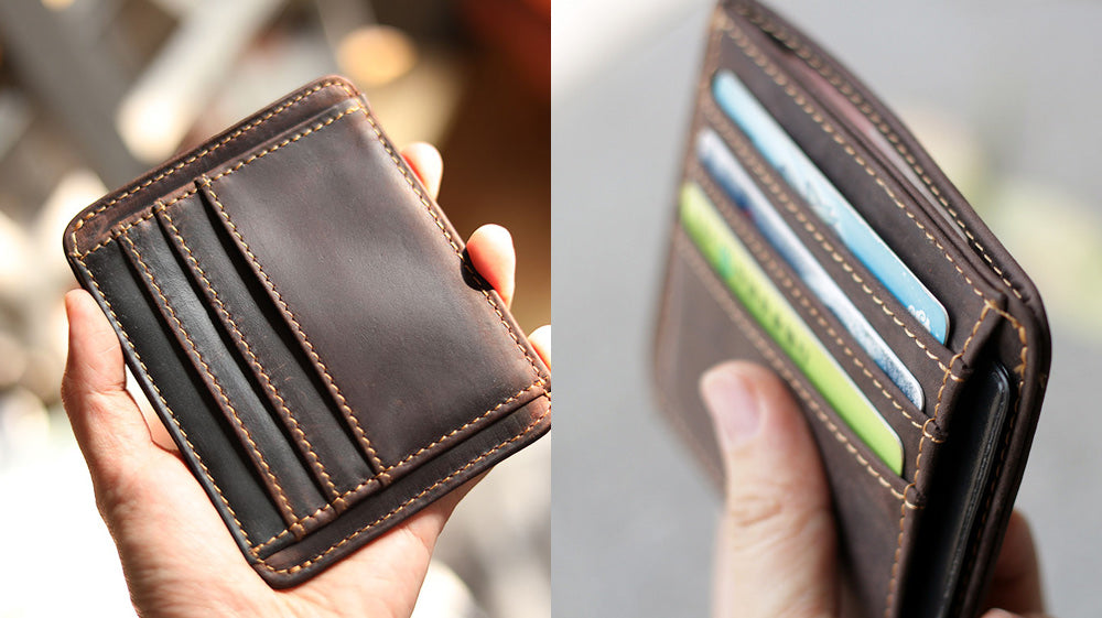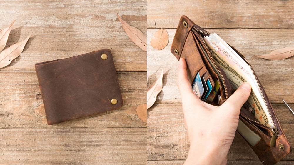 - Another distressed type of leather on our list is this awesome slim wallet that comes with a coin purse attached to it! It is also bifold that makes it store cards and full cash! It is a go-to wallet for how it functions! Measuring 11cm x 10cm x 1cm, this wallet is available in black and coffee!