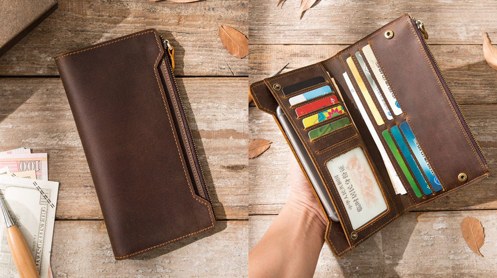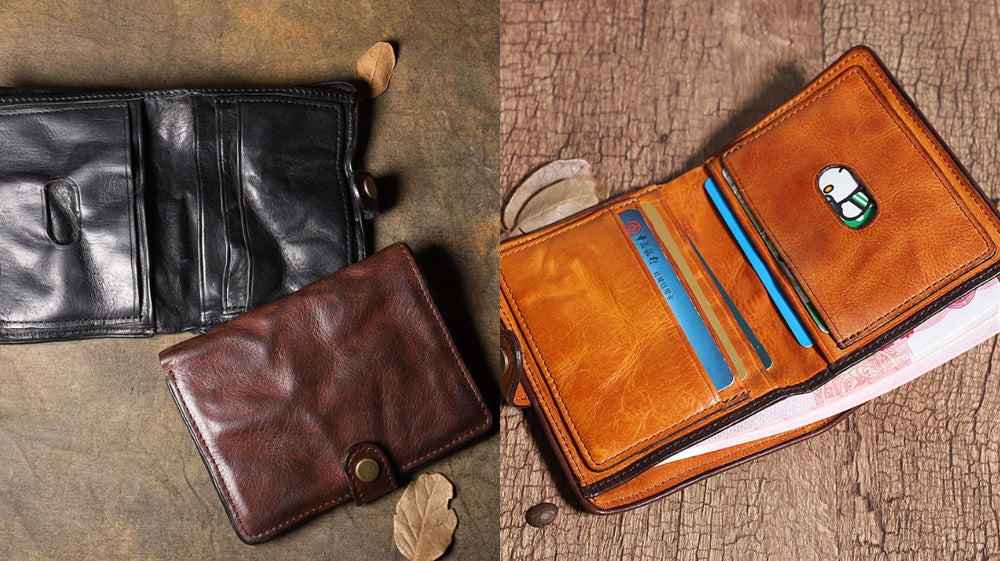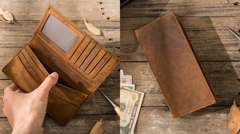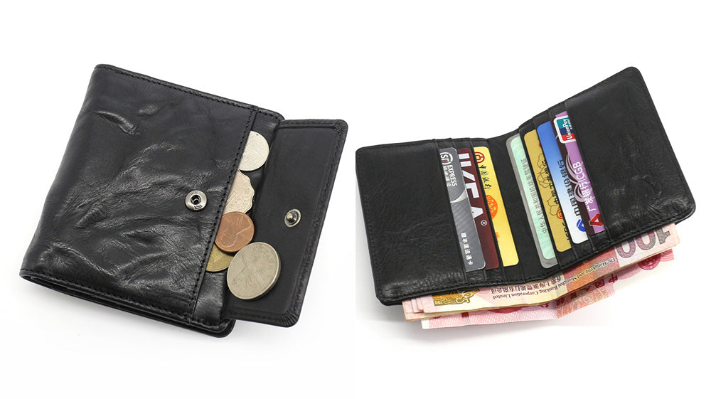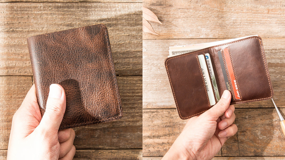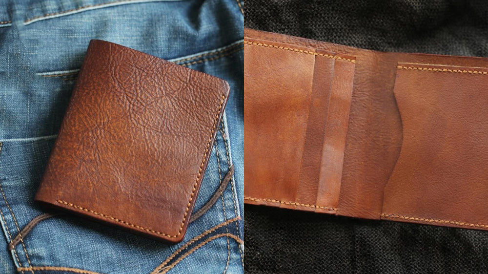 - Another distressed type of leather on our list is this awesome slim wallet that comes with a coin purse attached to it! It is also bifold that makes it store cards and full cash! It is a go-to wallet for how it functions! Measuring 11cm x 10cm x 1cm, this wallet is available in black and coffee!