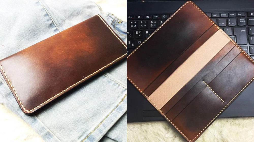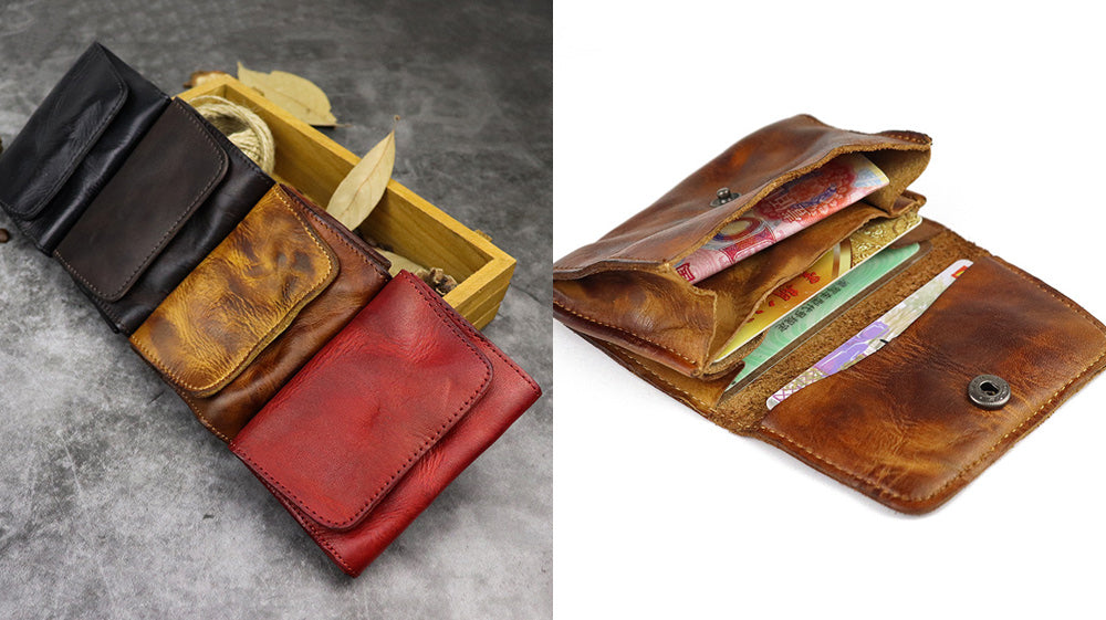 - Everyone is loving this slim wallet's vintage and dyed design. It's composed of stitches on the edges and good materials like leather! It comes in different colors like brown, black, coffee and red! It is enclosed with a magnetic button for more security of one's cards and cash! Not only fashionable, this wallet is also extra useful!