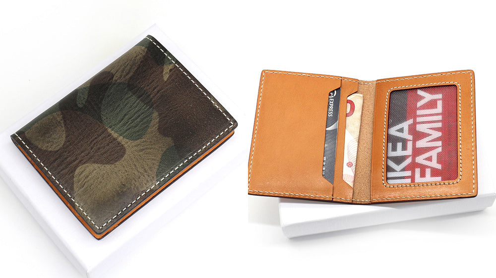 - Are you a fan of camouflage designs with stitched details, this slim wallet is how it is executed! Colors available are green and tan-- this wallet is also portable and lightweight, yet it remains to be useful as it can store numerous cards and some full cash! It has a measurement of 11cm x 8cm x 1cm.
