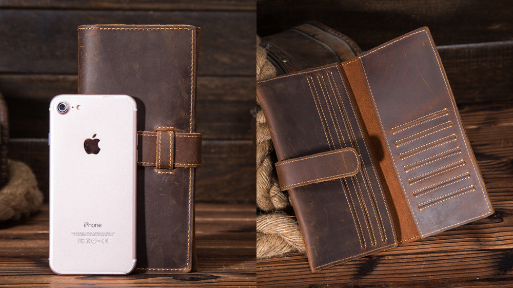 - One that is long, slim and fashionable is this wallet! It is handy despite its size and quality leather! It is packed with spacious storage for both cards and cash. It comes with a not so complicated design and is securely enclosed with a strap! Available in brown, it measures 19cm x 9.5cm x 1.5cm.