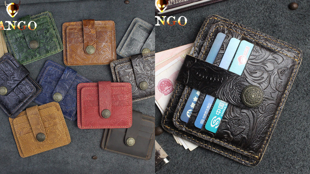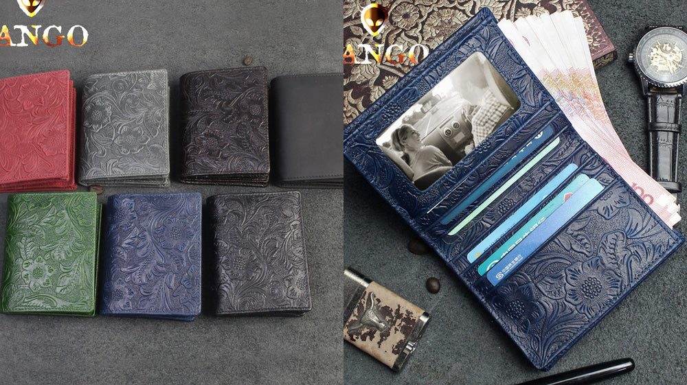 - This beautiful slim wallet is ordained with embossed details and floral designs! It is so precious to look at that it became an instant hit to our women customers. It is bifold and can store both cards and cash. It has a measurement of 11.5cm x 9cm x 2cm. Colors available are black coffee, black, red, blue, green, gray and vintage black.