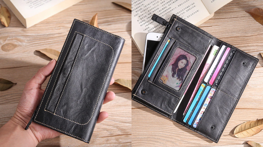 - Casually styled, this slim wallet is most suitable for students and office workers. It is black in color. The white stitches and details made it much fancier. It is composed of different storage for cards and cash. It also has an extra zippered purse for change or coins. Measuring 19cm x 9.5cm x 1cm, this wallet is a good handy-dandy long wallet!