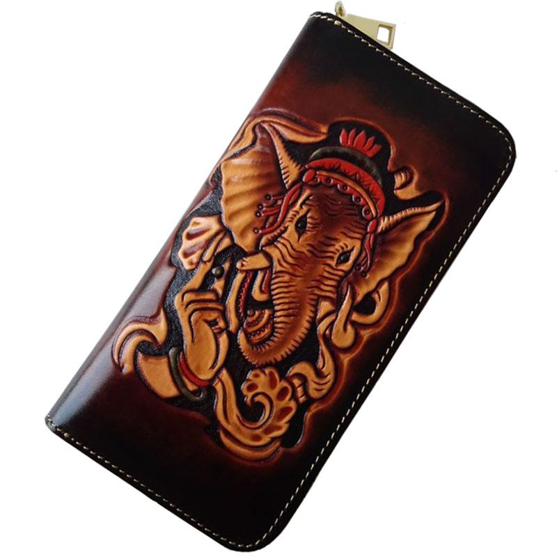 Style: Brown Handmade Ganesha Leather Long Wallet Zipper Wallet Clutch Wallet For Men