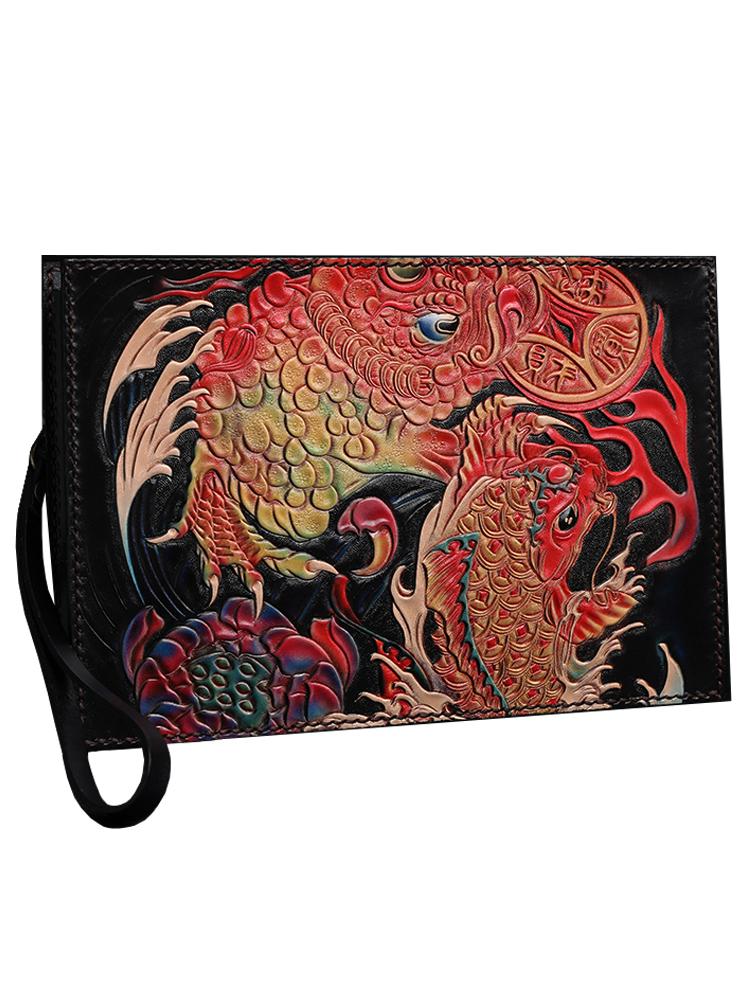 Style: Black Handmade Tooled Leather Carp Chinese Dragon Clutch Wallet Wristlet Bag Clutch Purse For Men