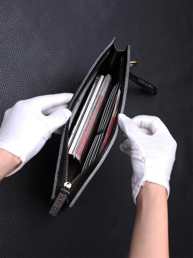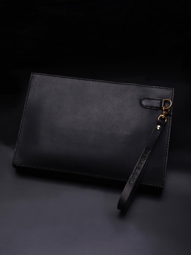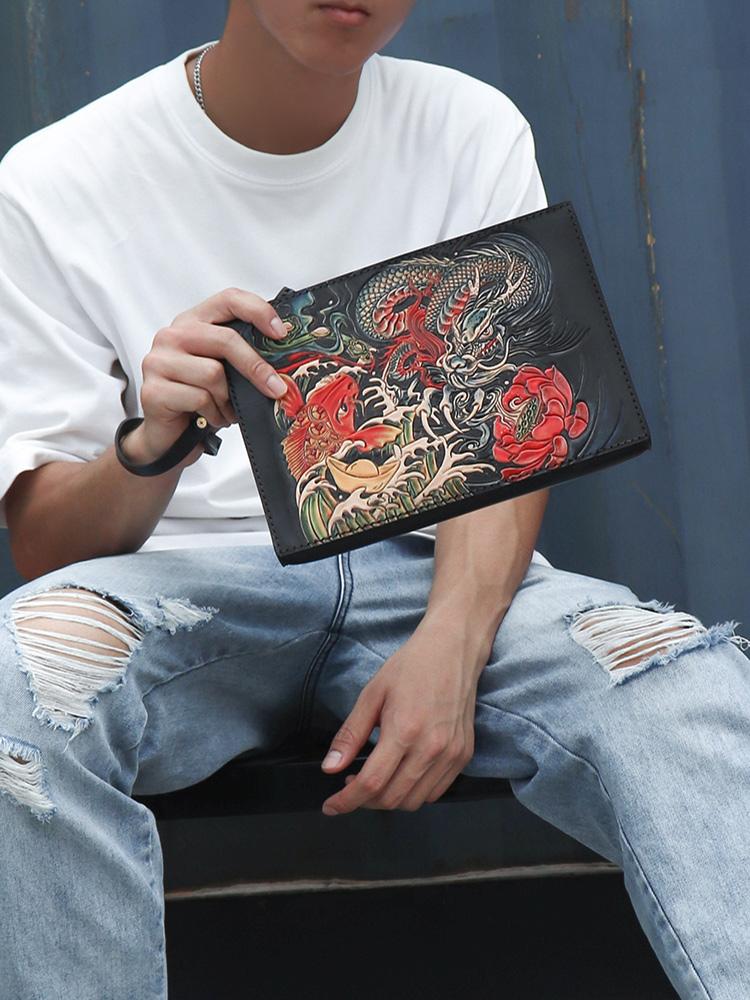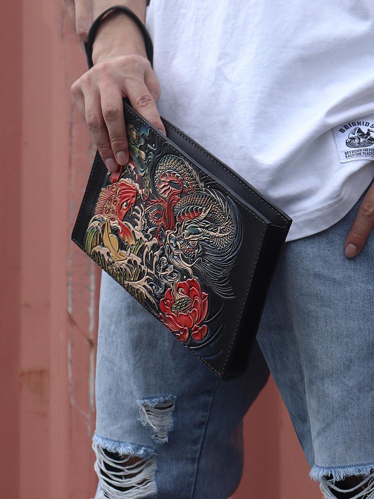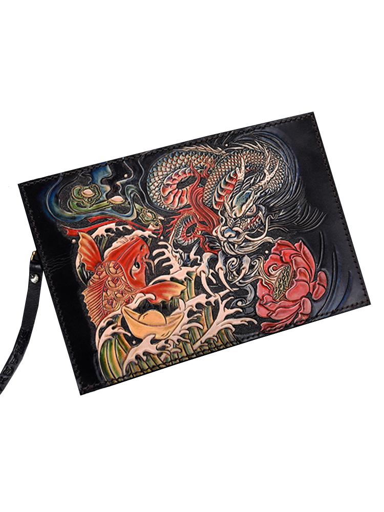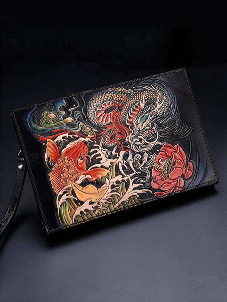 Design: Black Handmade Tooled Leather Carp Chinese Dragon Clutch Wallet Wristlet Bag Clutch Purse For Men