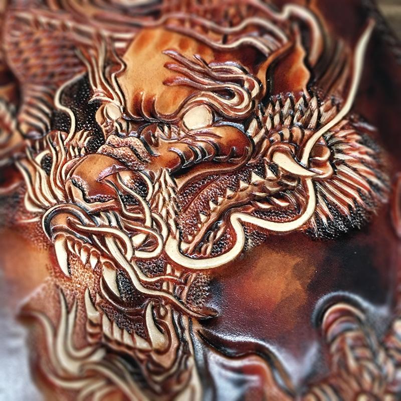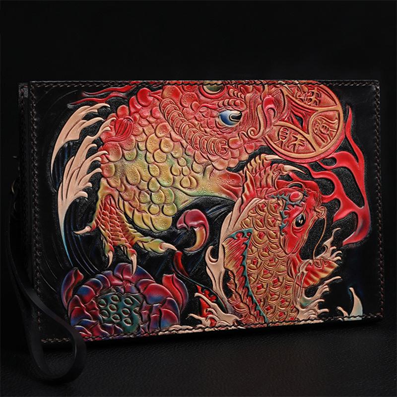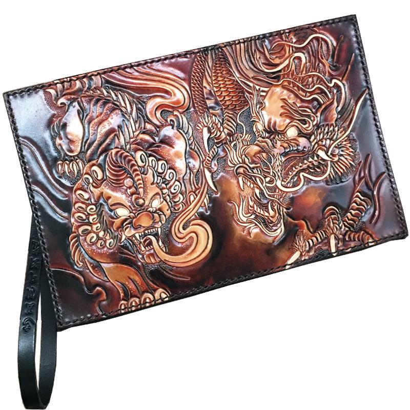 Design: Black Handmade Tooled Leather Chinese DragonClutch Wallet Wristlet Bag Clutch Purse For Men