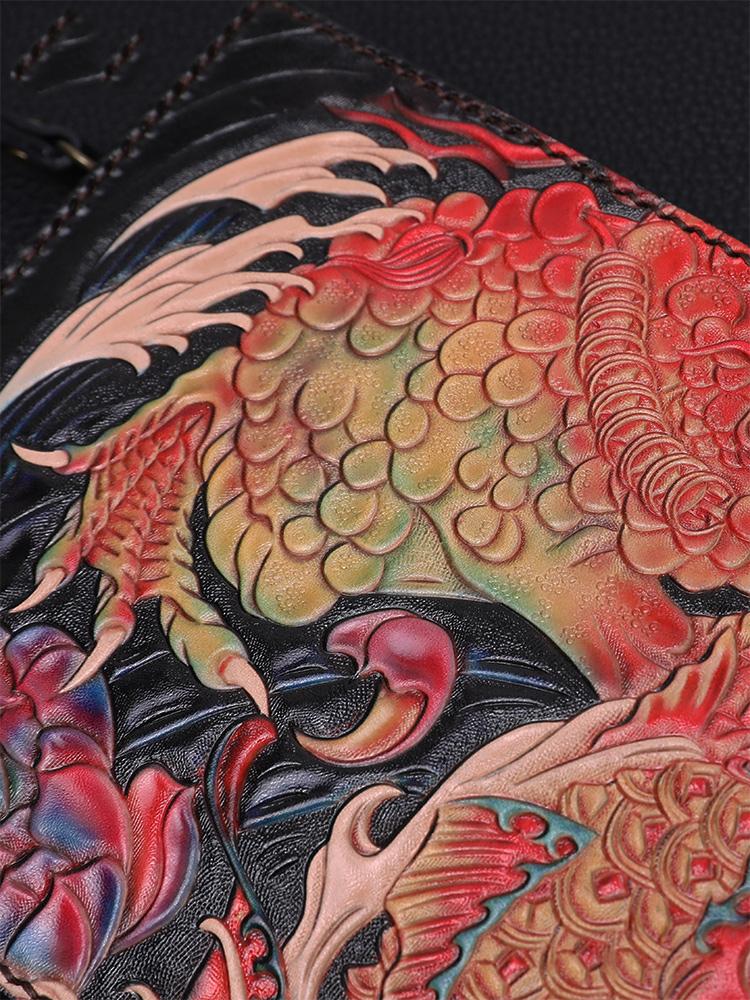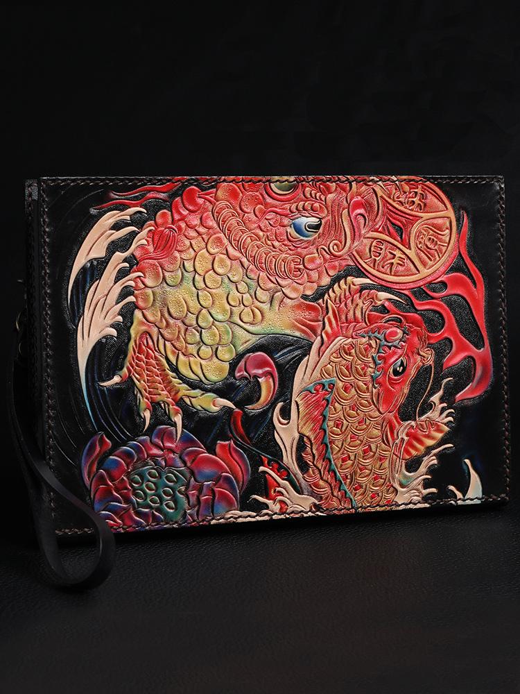 Style: Black Handmade Tooled Leather Mahākāla Clutch Wallet Wristlet Bag Clutch Purse For Men