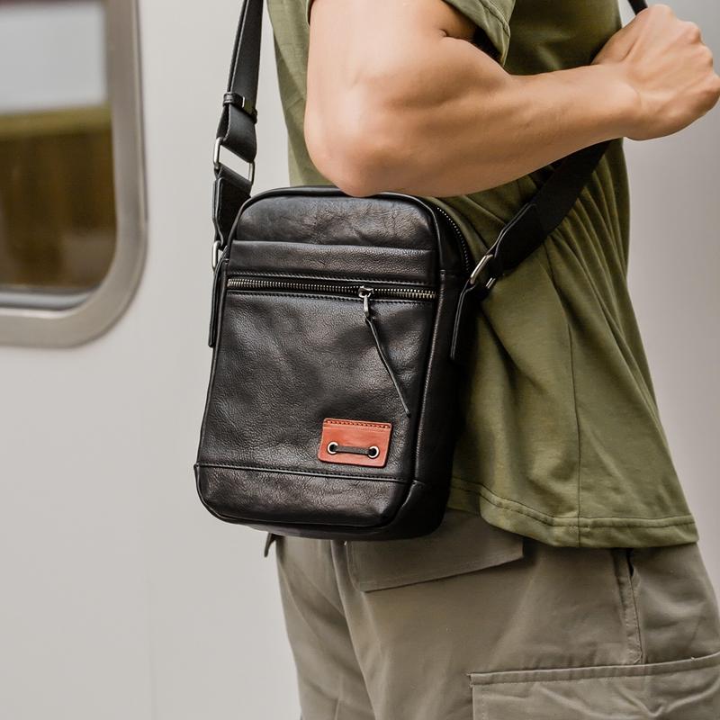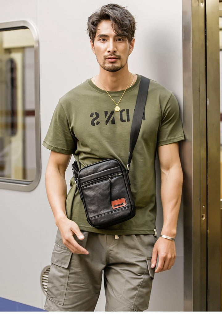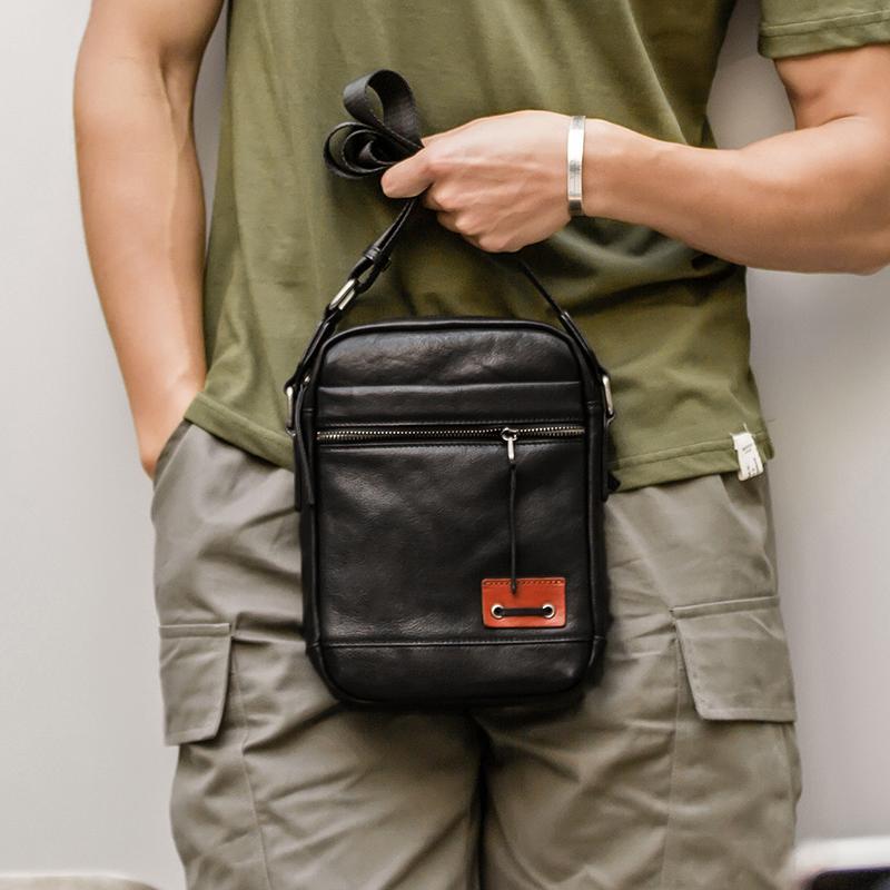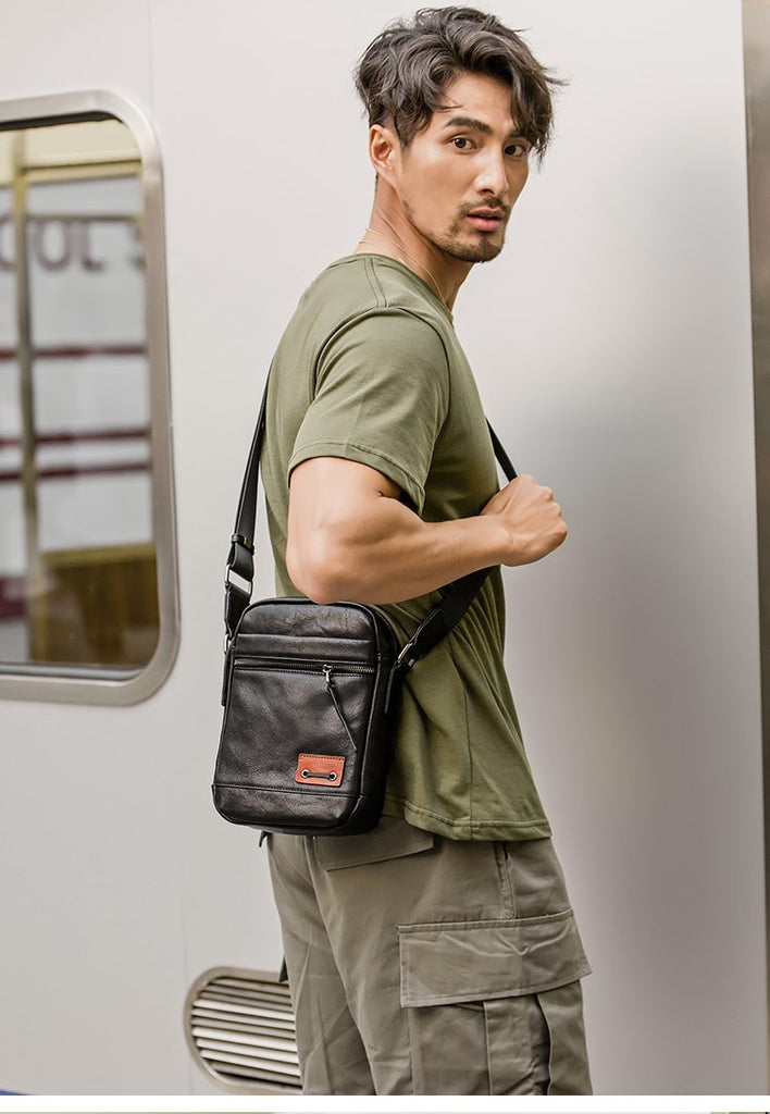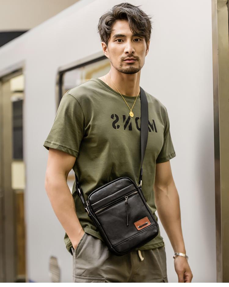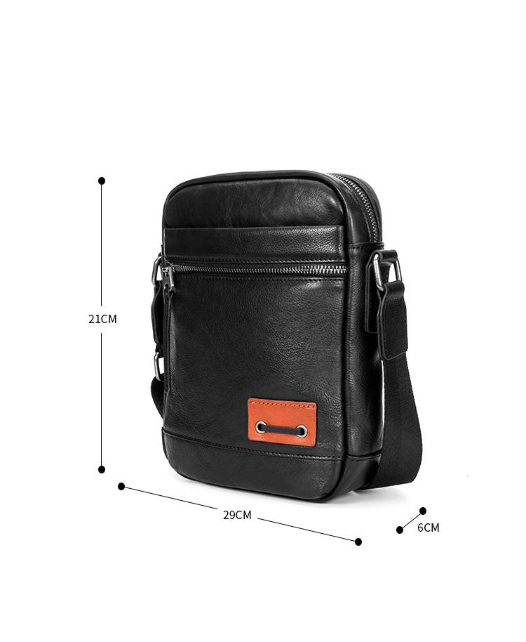 Design: Black Small Leather Mens 8 inches Soft Shoulder Bag Black Messenger Bags Side Bag for Men