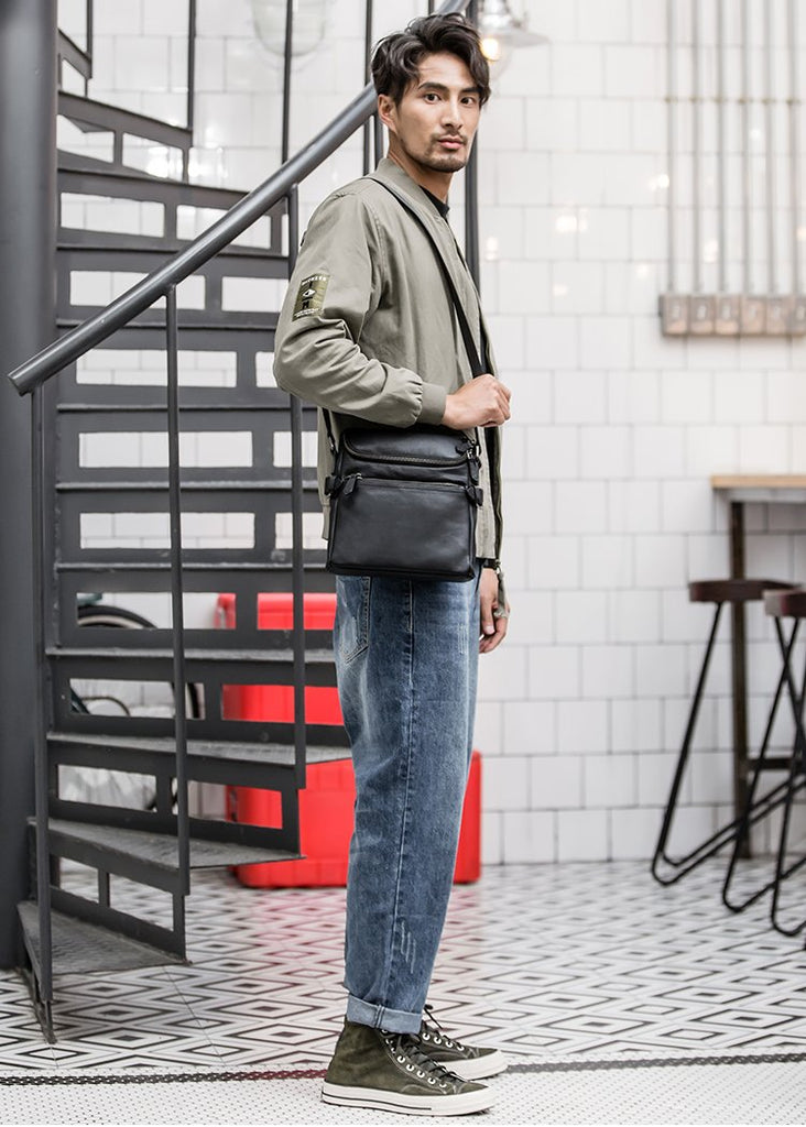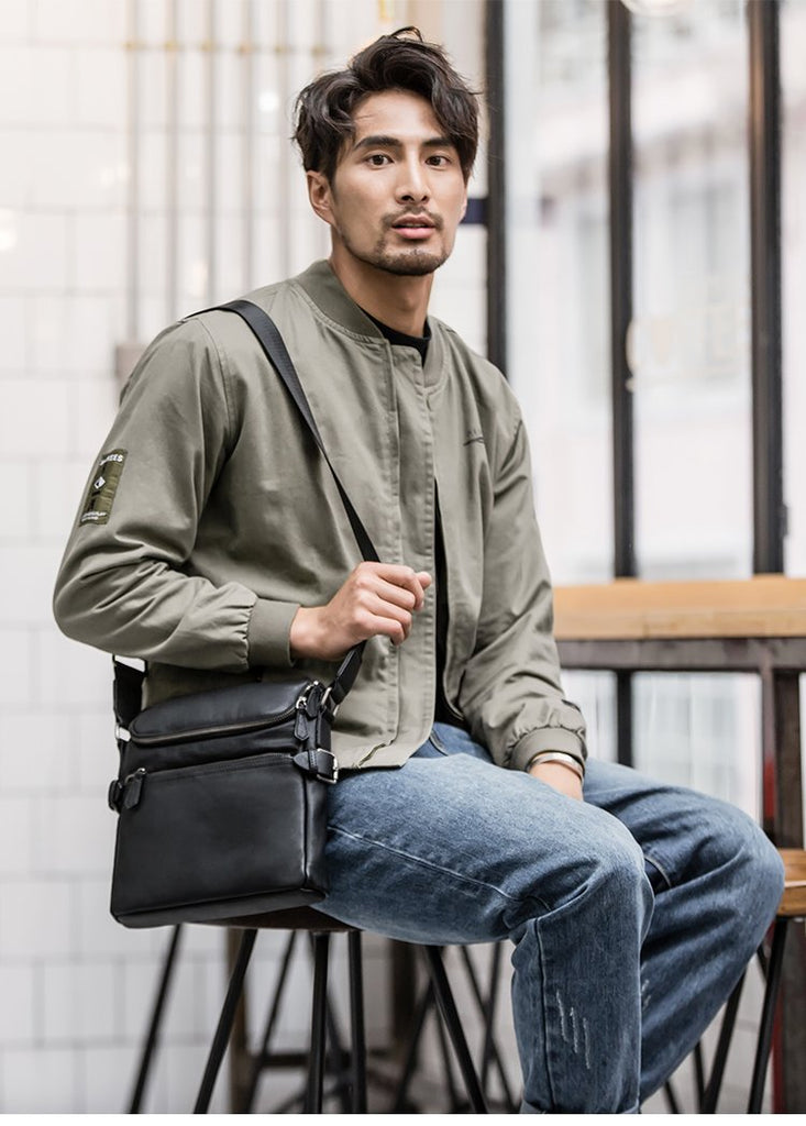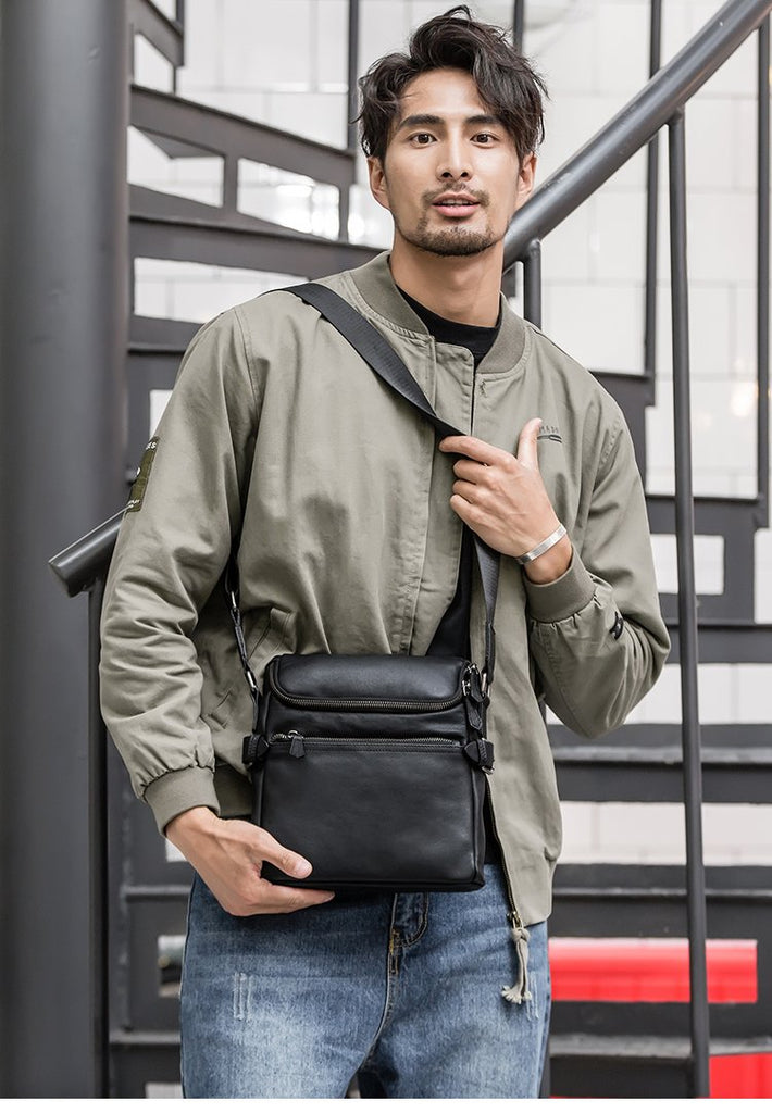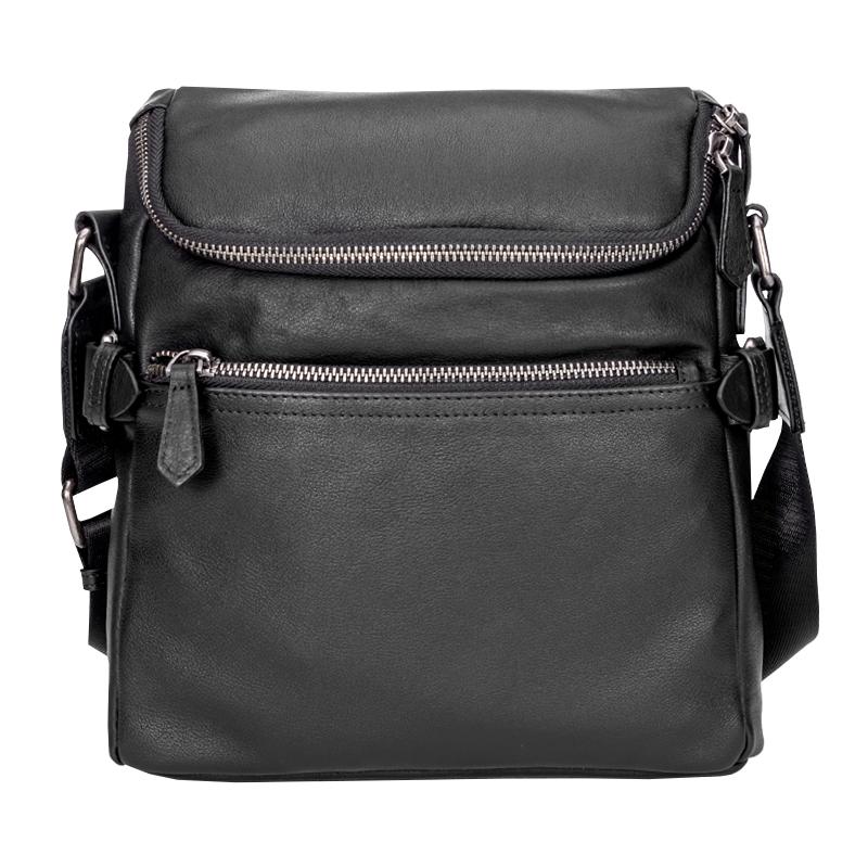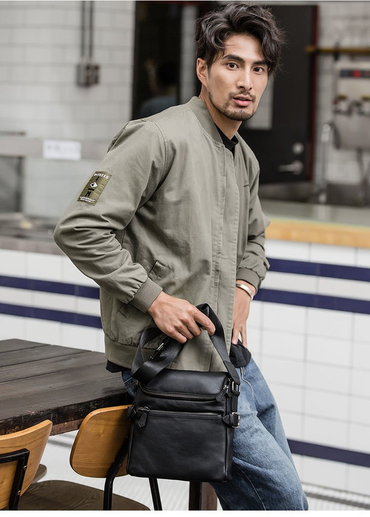 Design: Black Soft Leather Mens 10 inches Business Postman Bag Black Messenger Bags Side Bag for Men