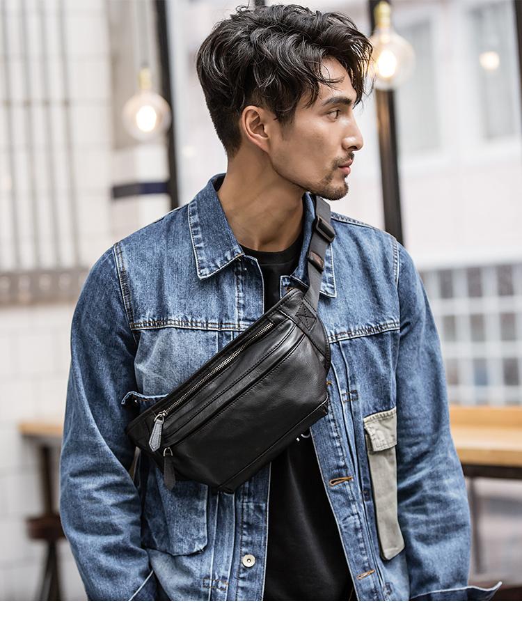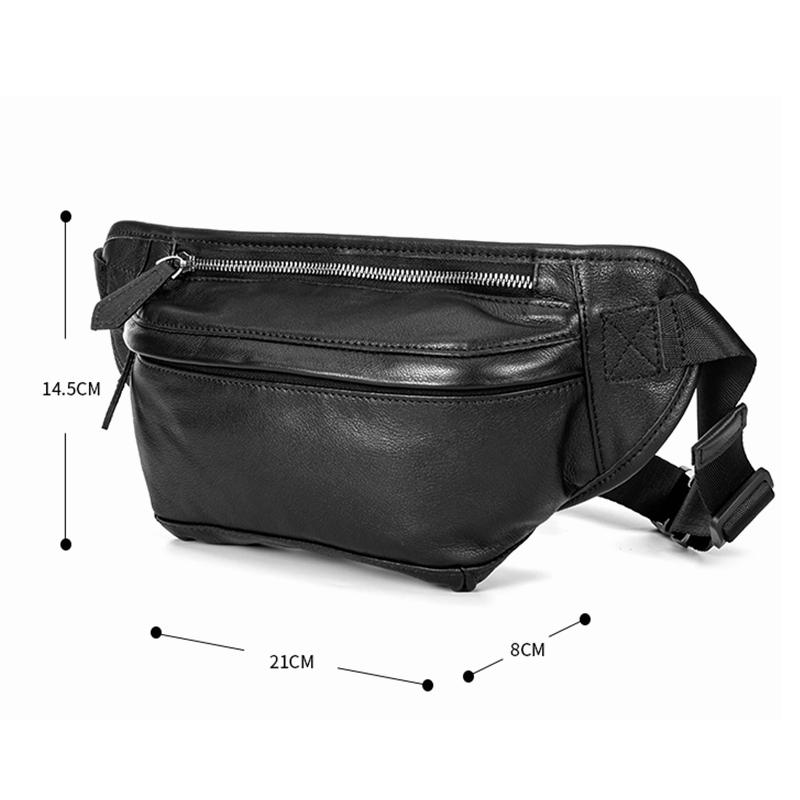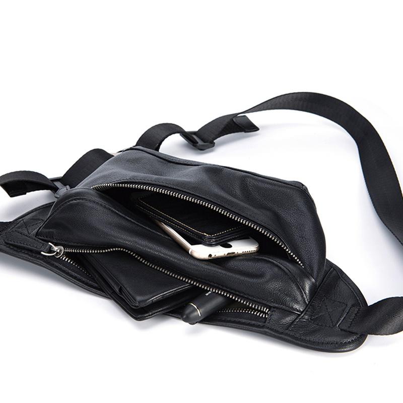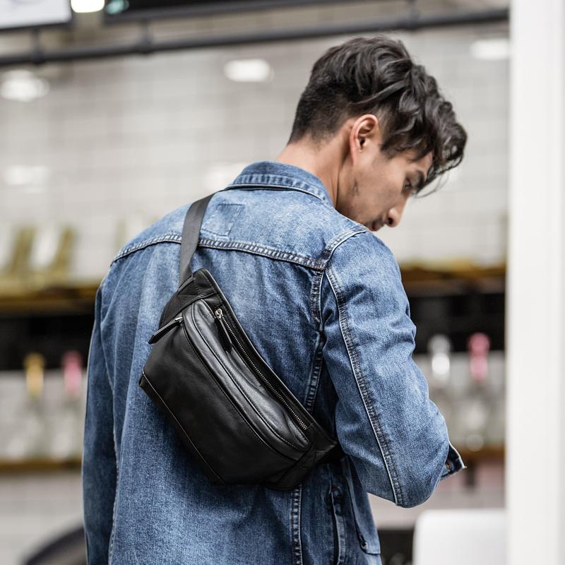 Style: Black Soft Leather Mens 8inches Waist Bag Chest Bag Black One Shoulder Backpack for Men