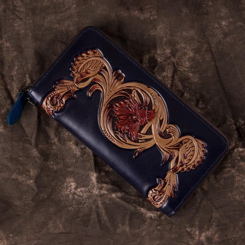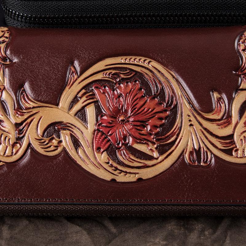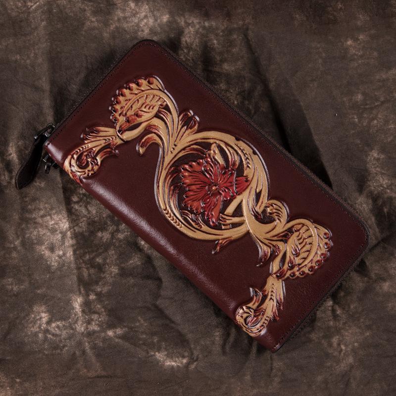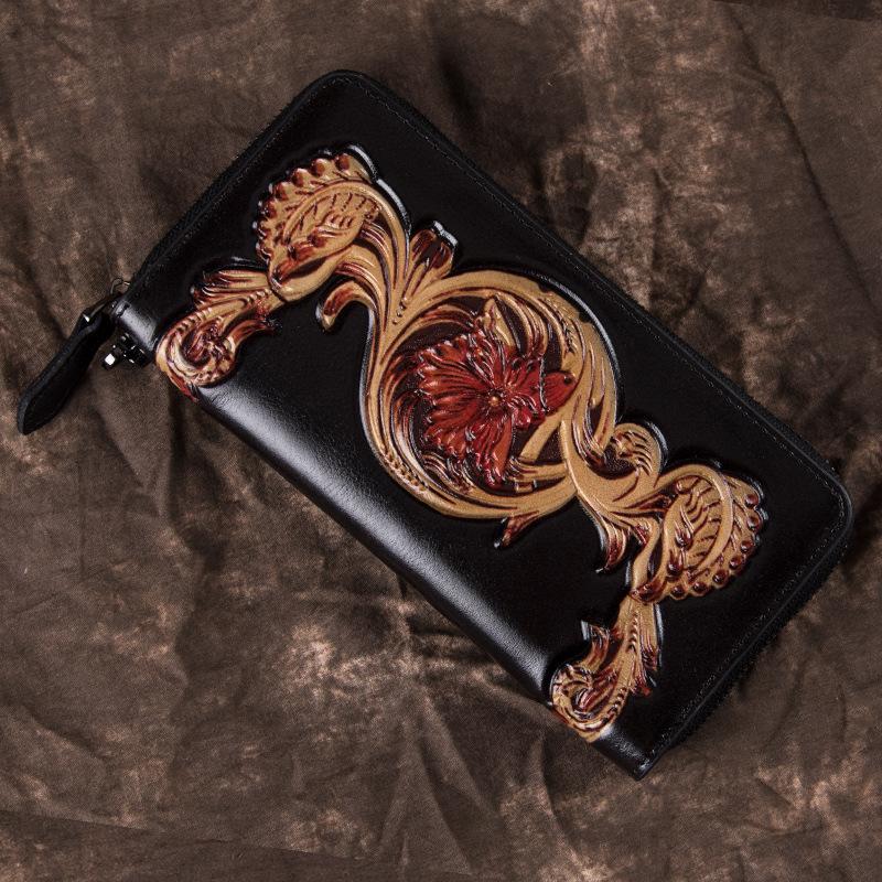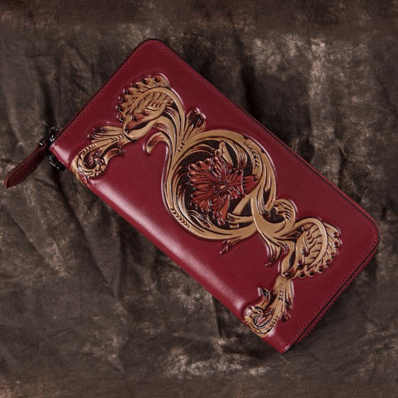 Black Tooled Leather Men's Bifold Long Zipper Wallet Clutch Bag Red For Women