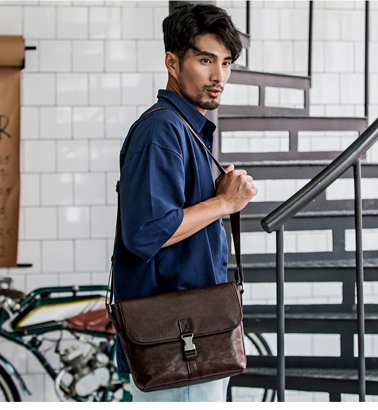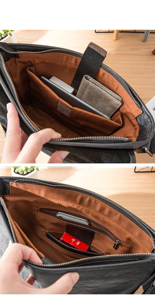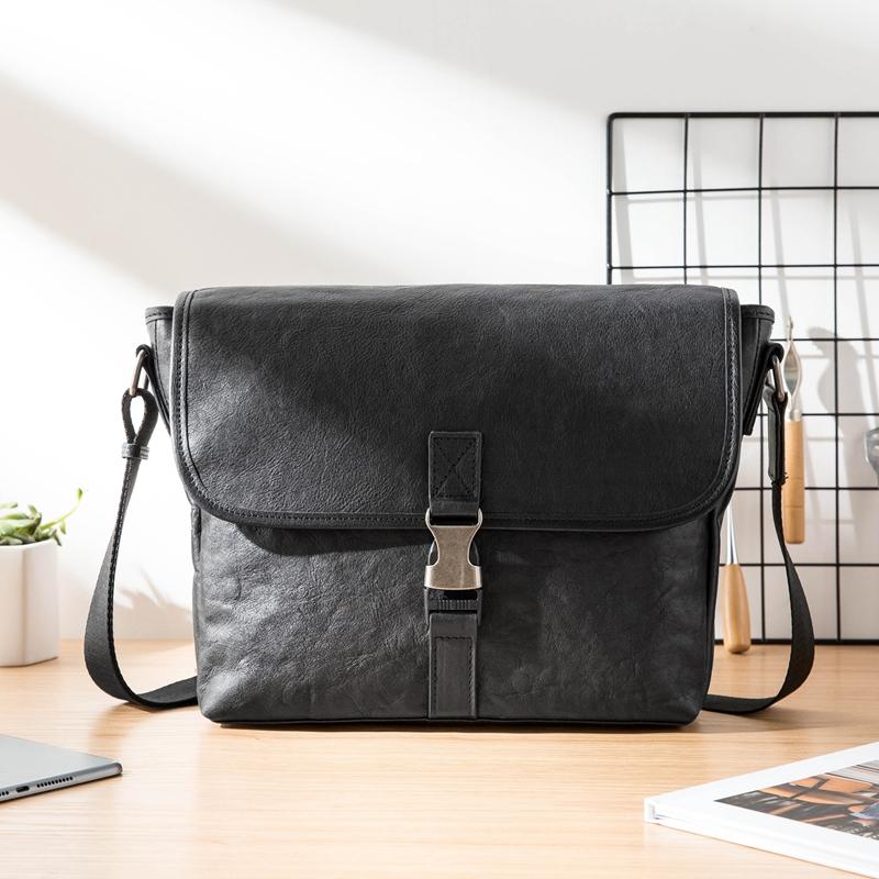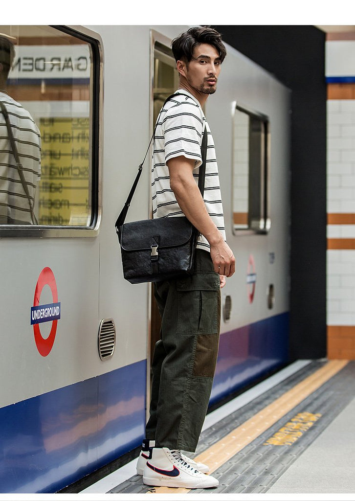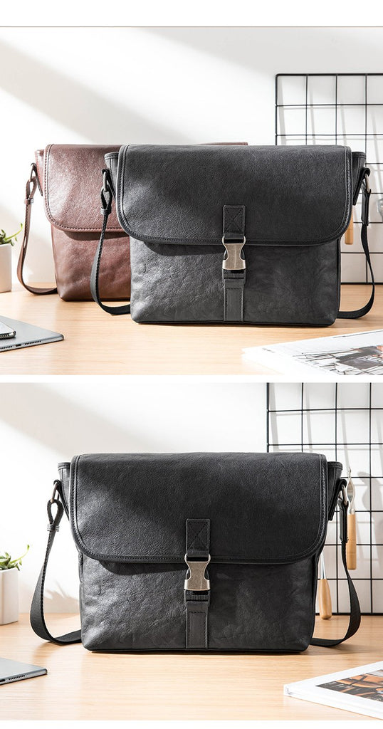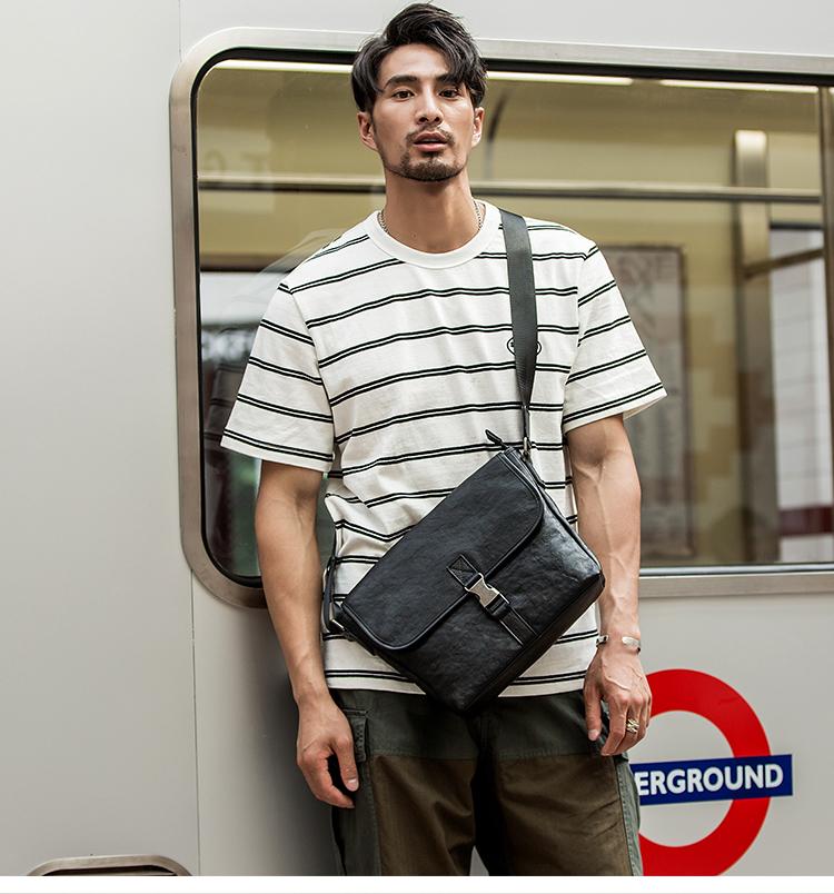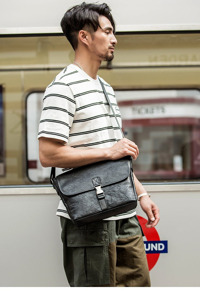 Design: Black Wrinkled Leather Mens 11 inches Side Bag Messenger Bags Soft Casual Bicycle Bags for Men