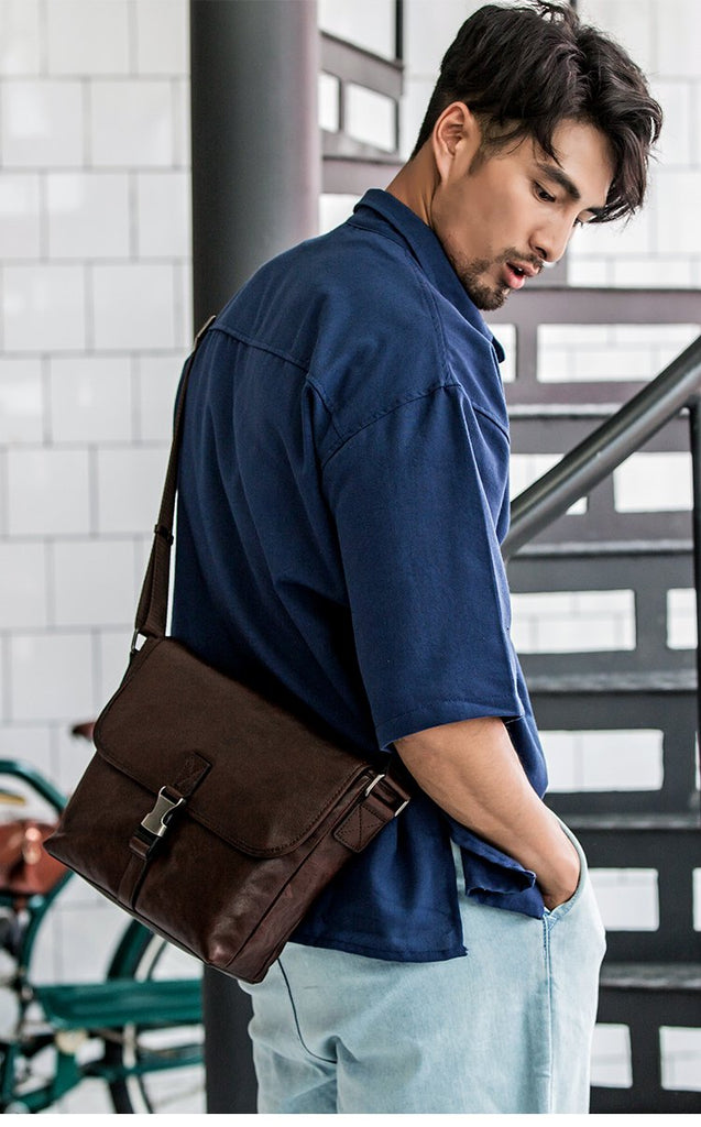 Style: Black Wrinkled Leather Mens 11 inches Side Bag Messenger Bags Soft Casual Bicycle Bags for Men