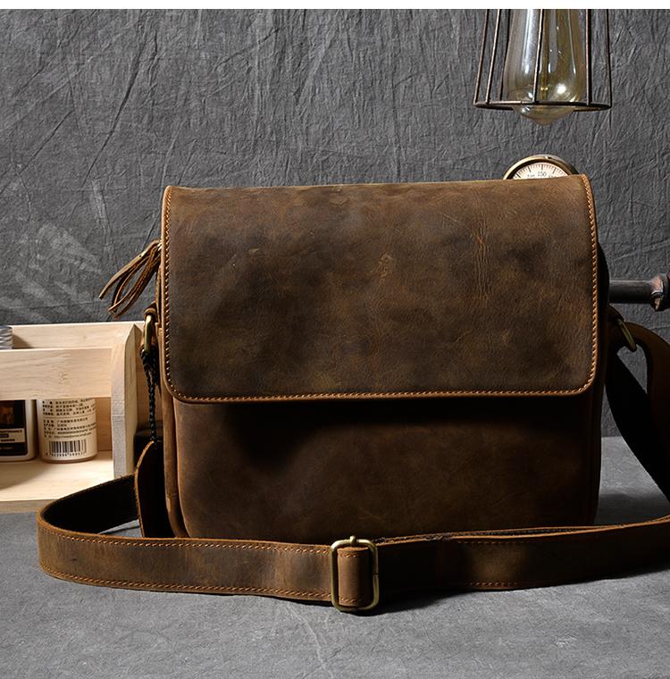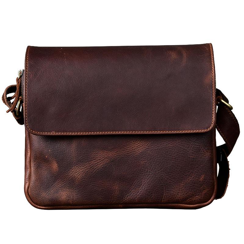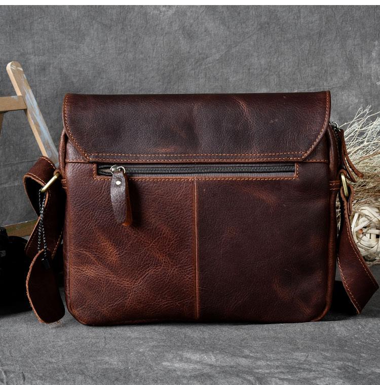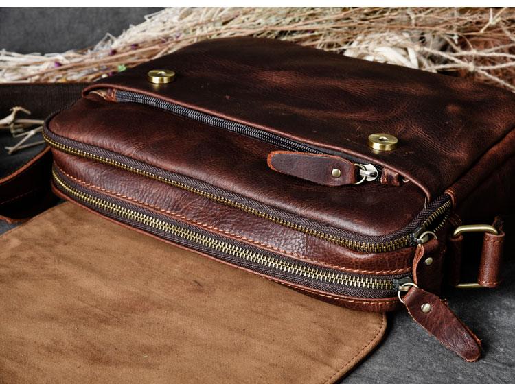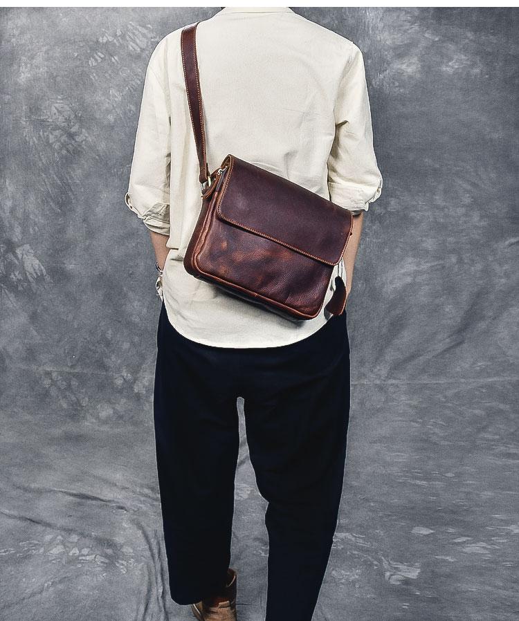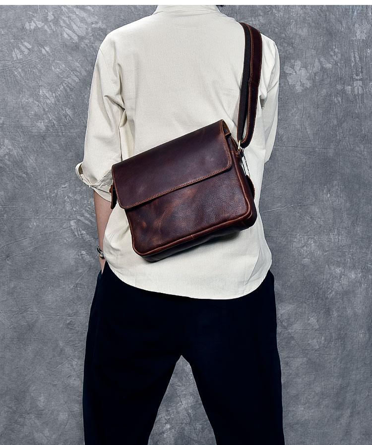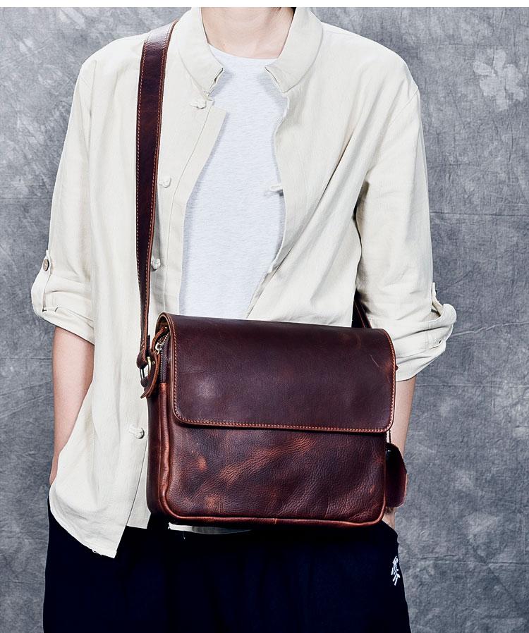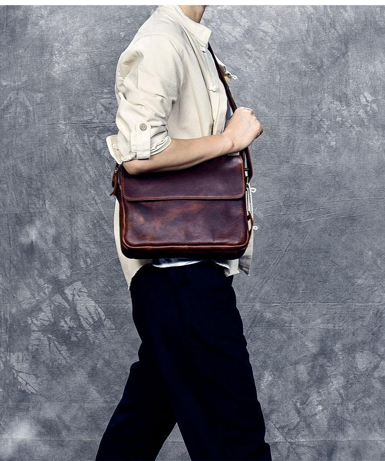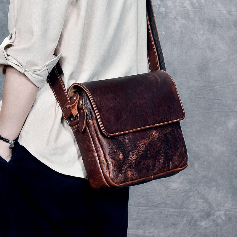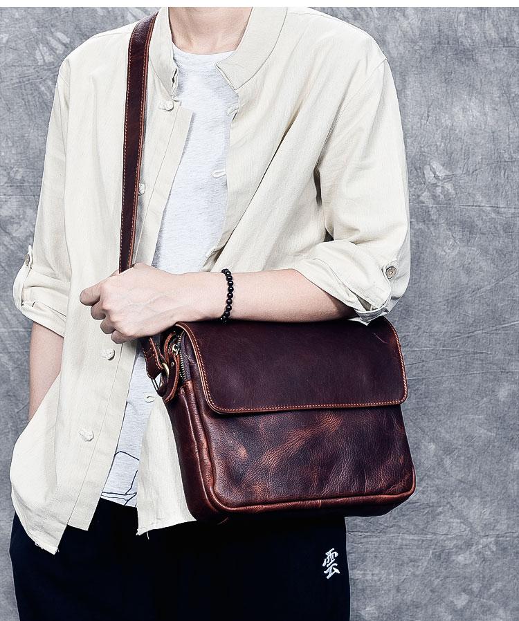 Design: Leather Mens 8‘’ Red Brown Small Side Bag Retro Messenger Bag Shoulder Bag For Men