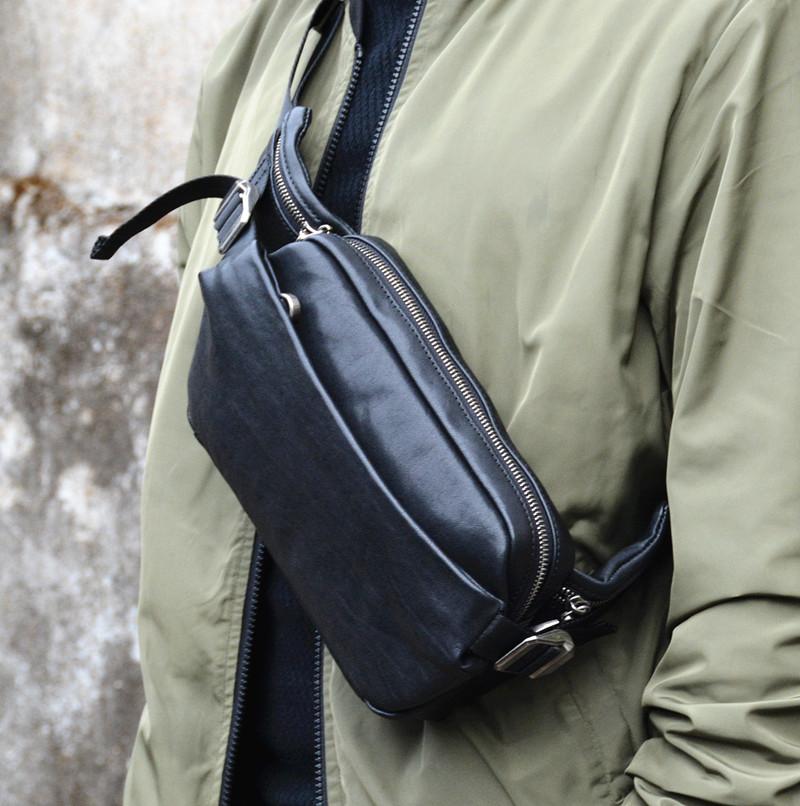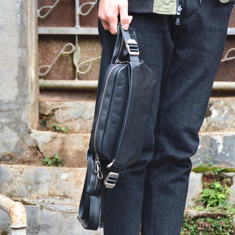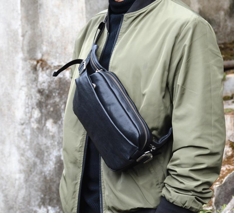 Design: Cool Leather Black Fanny Pack Men's Black Chest Bag Hip Bag Small Waist Bag For Men