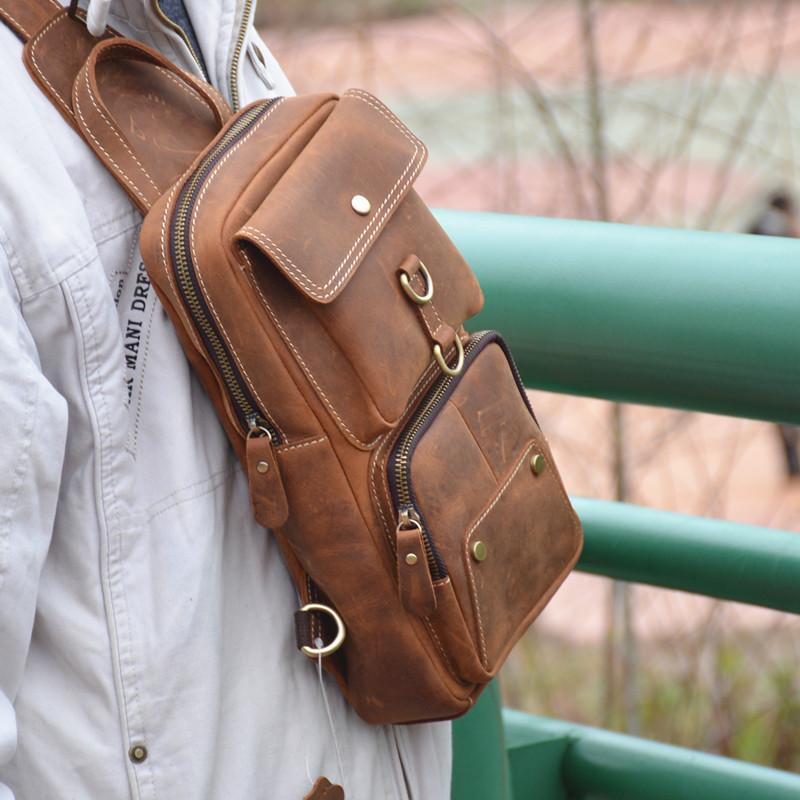 Style: Cool Brown Leather Men's Sling Bag Chest Bag Brown One Shoulder Backpack For Men
