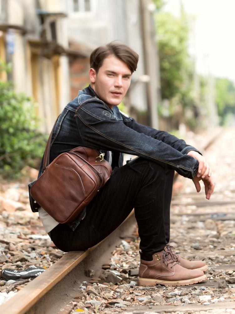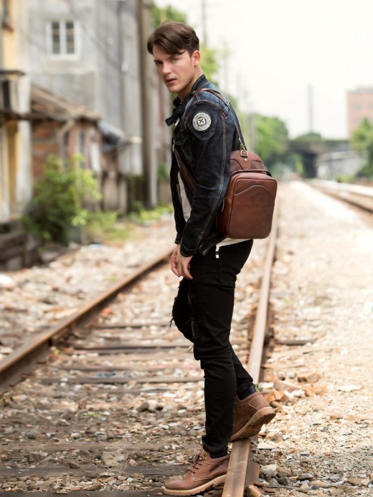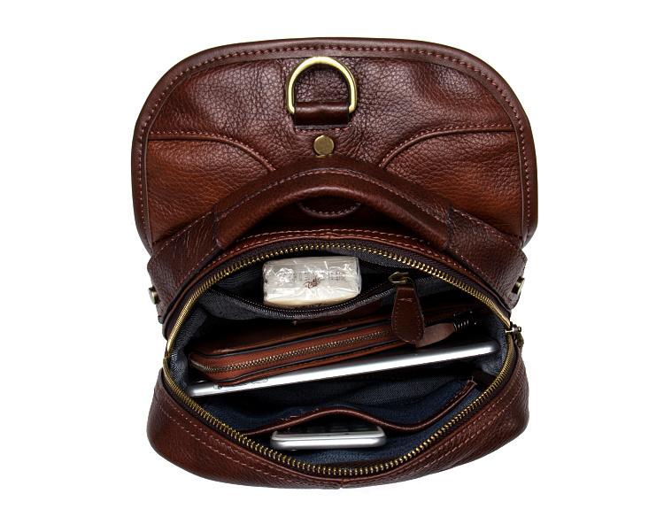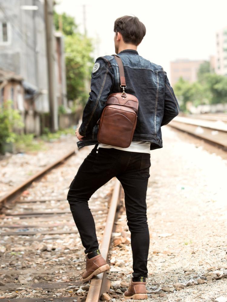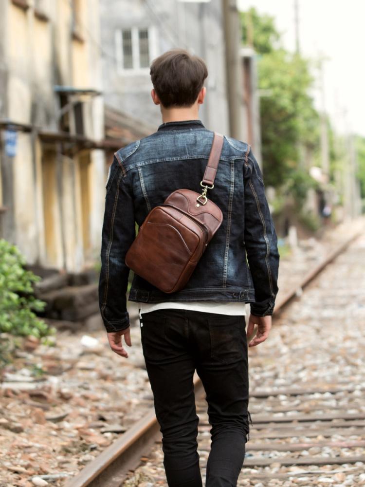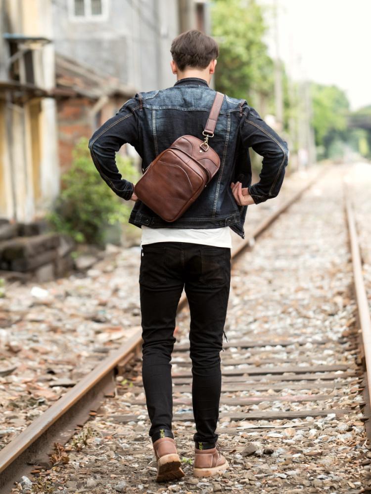 Design: Red Brown Casual Leather Mens 8 inches Sling Bags Chest Bags One Shoulder Backpack for Men