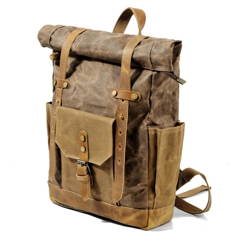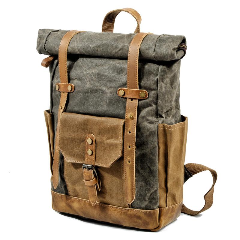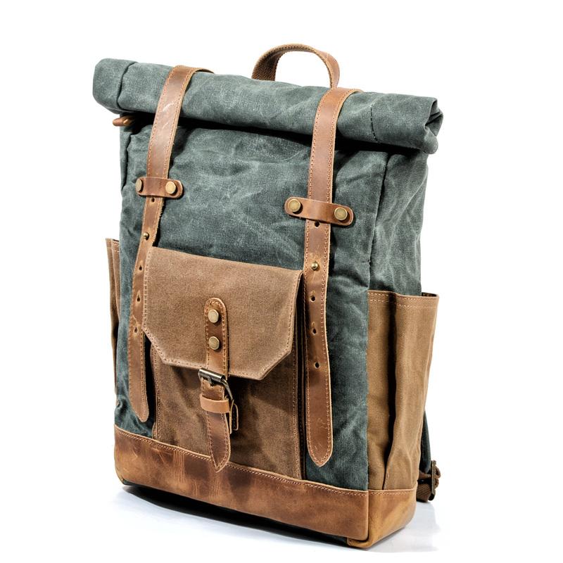 Style: Cool Canvas Leather Mens Green Large Waterproof Travel Backpack Computer Hiking Backpack for Men
