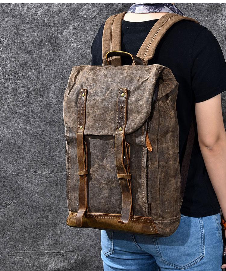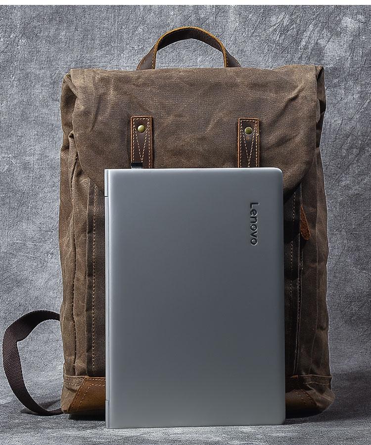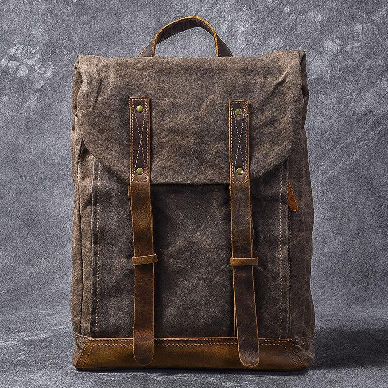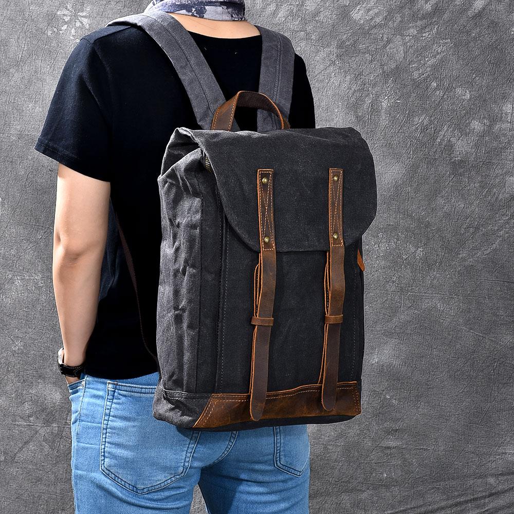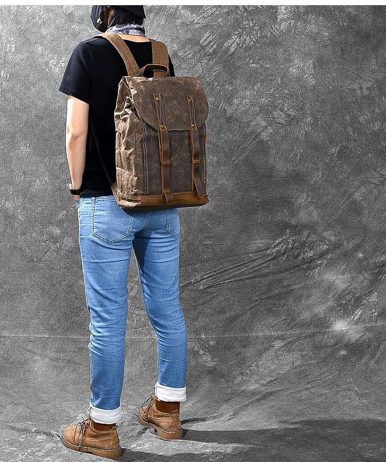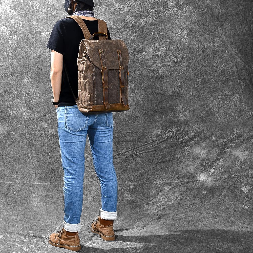 Waxed Canvas Leather Mens 15" Gray Computer Backpack Brown Travel Backpack College Backpack for Men