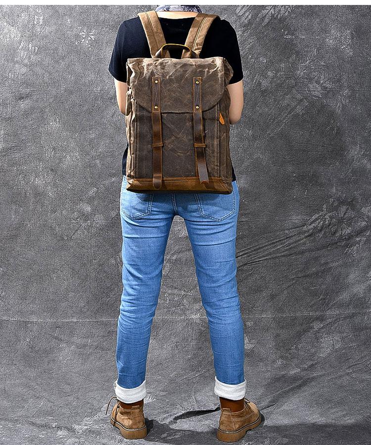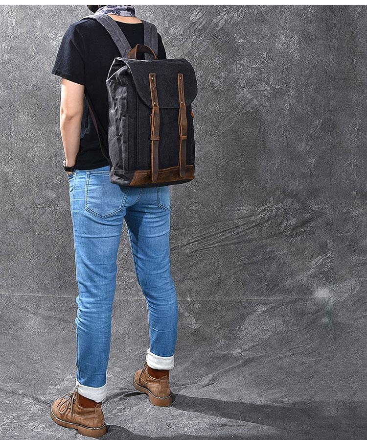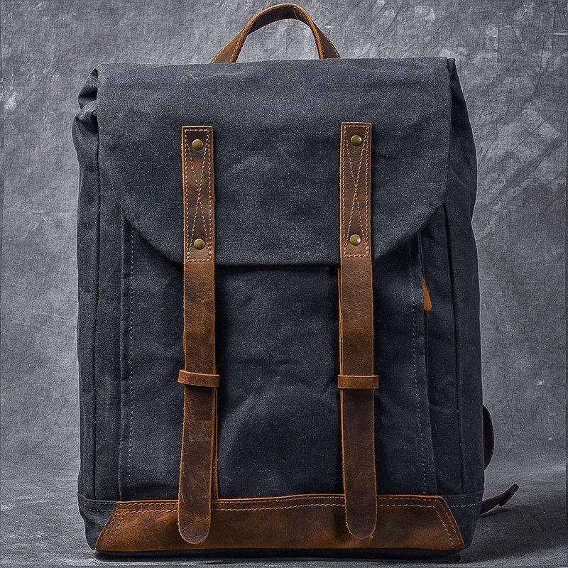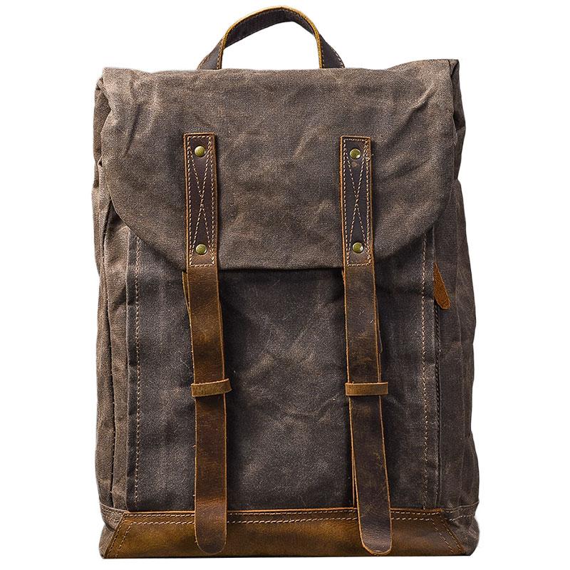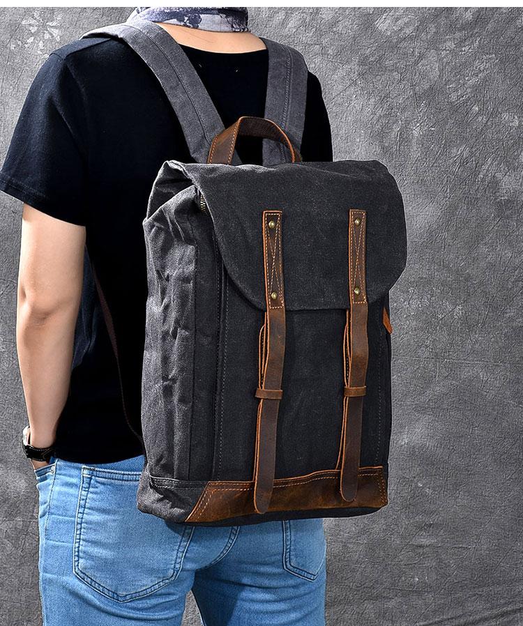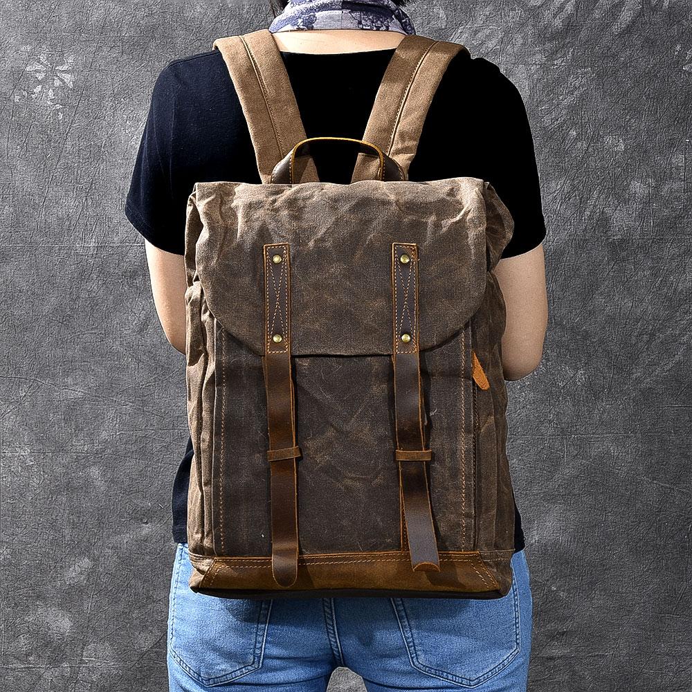 Waxed Canvas Leather Mens 15" Gray Computer Backpack Brown Travel Backpack College Backpack for Men