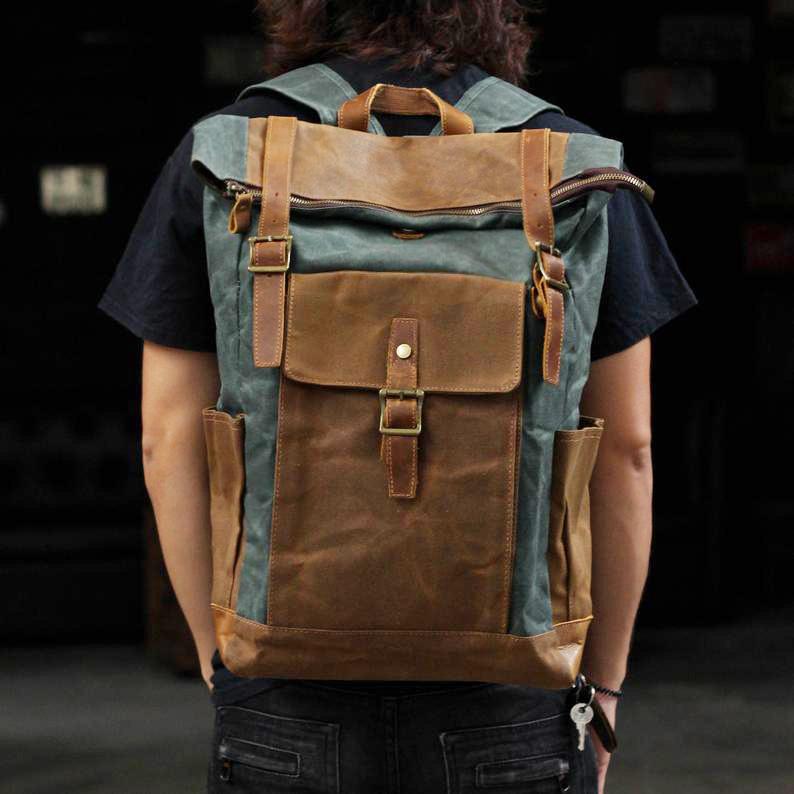 Cool Waxed Canvas Mens Waterproof Green Travel Backpack 15'' Gray Computer Backpack Hiking Backpack for Men