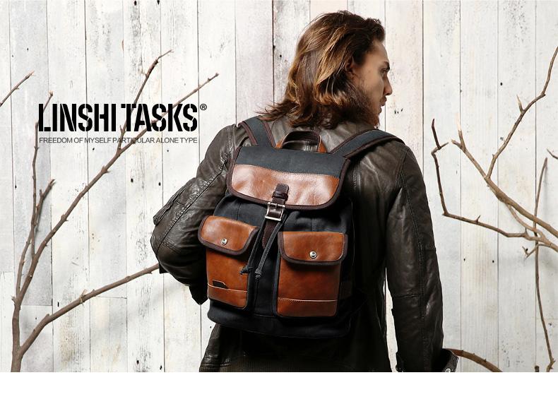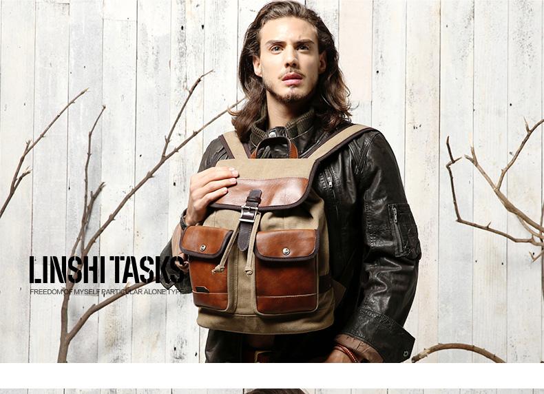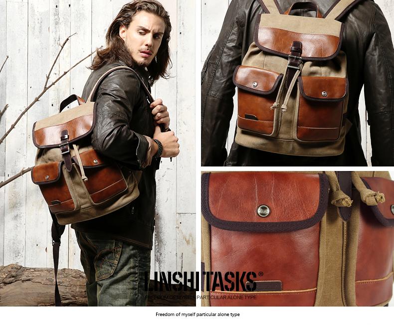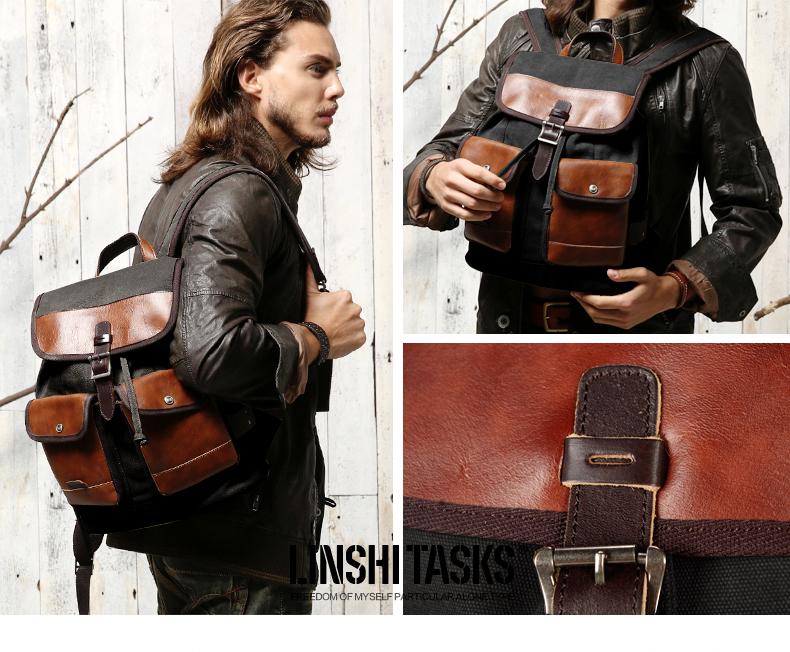 Design: Fashion Canvas Leather Mens Khaki Backpack School Backpack Black Canvas Travel Backpack For Men