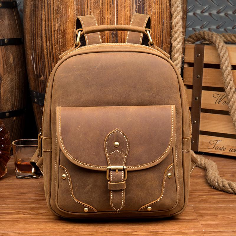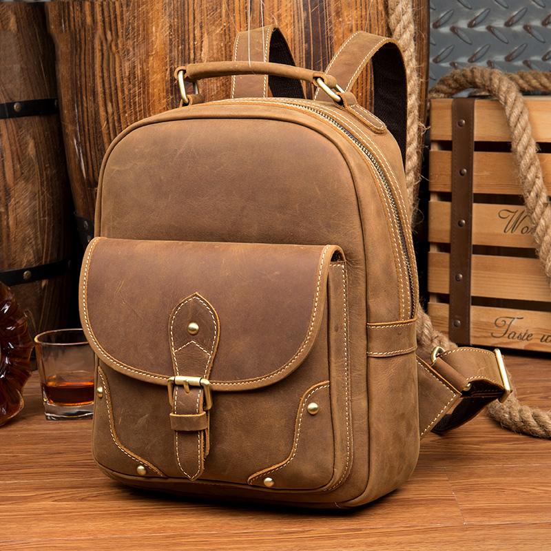 Style: Light Brown Fashion Mens Leather 12-inch Computer Backpacks Cool Travel Backpacks School Backpack for men