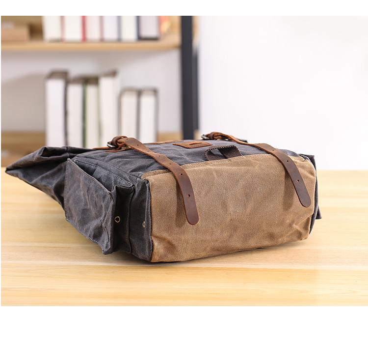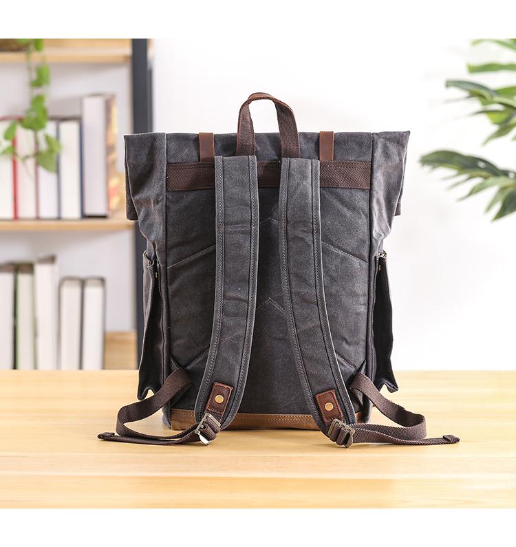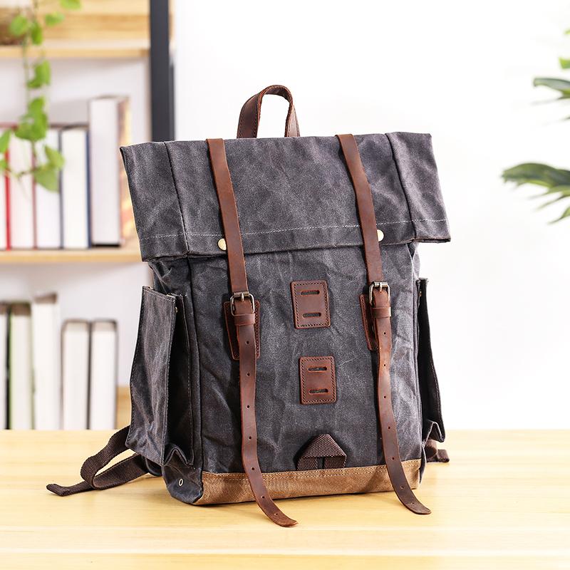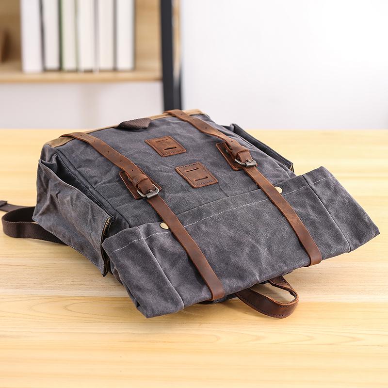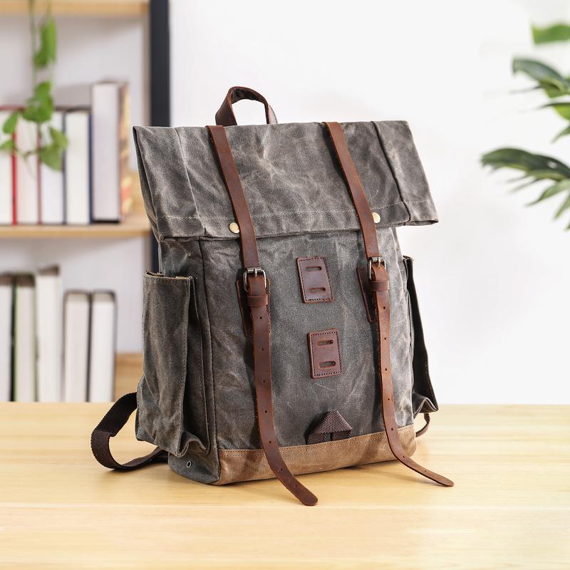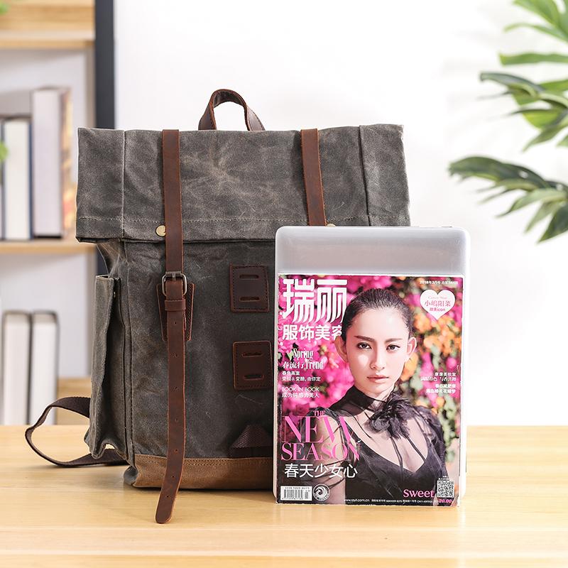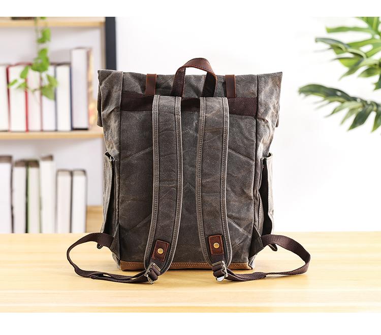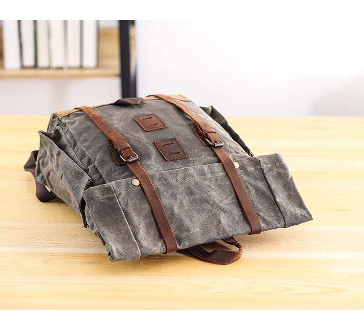 Design: Waxed Canvas Leather Mens 16‘’ Army Green Backpack Khaki Travel Backpack Dark Gray Hiking Backpack for Men