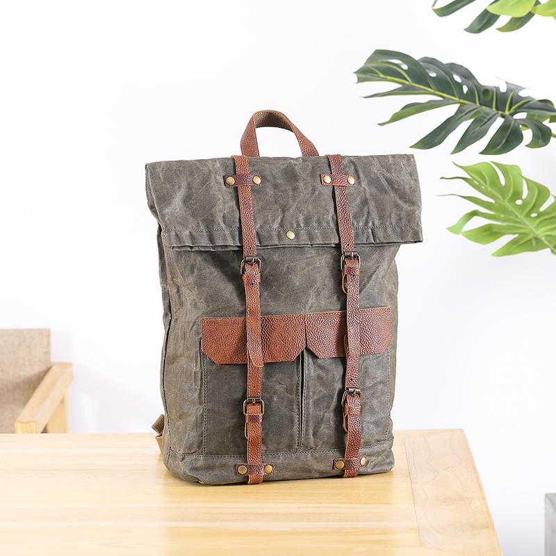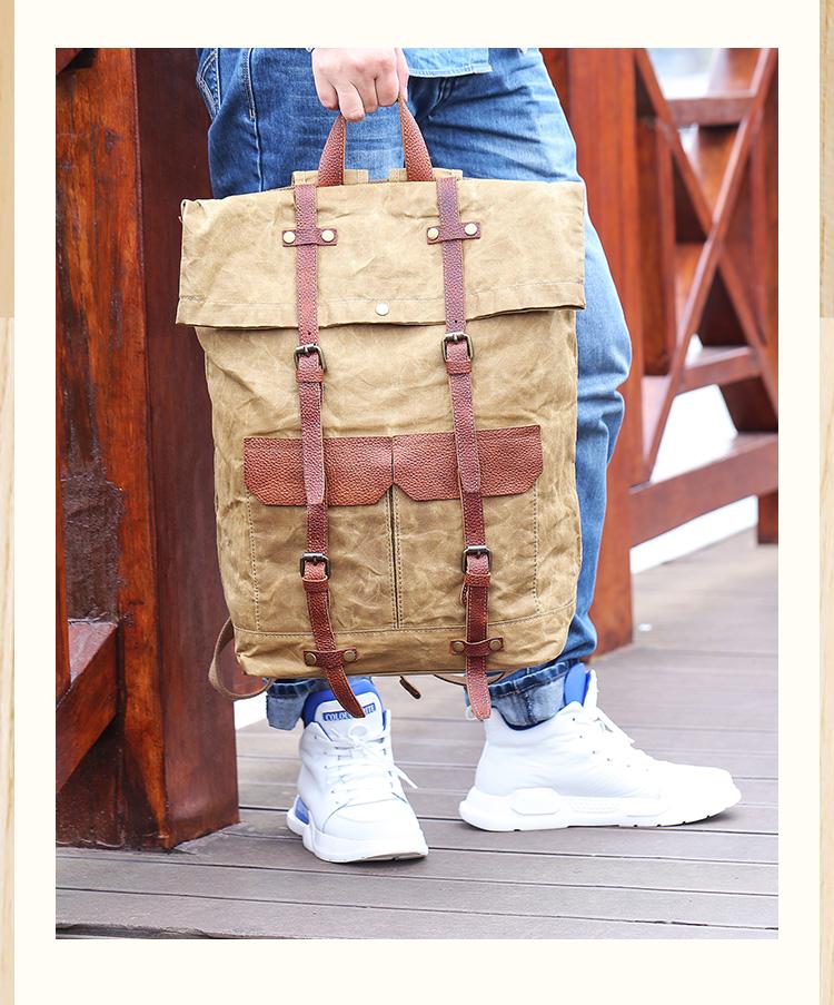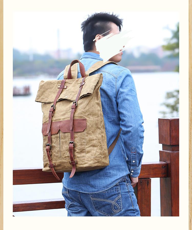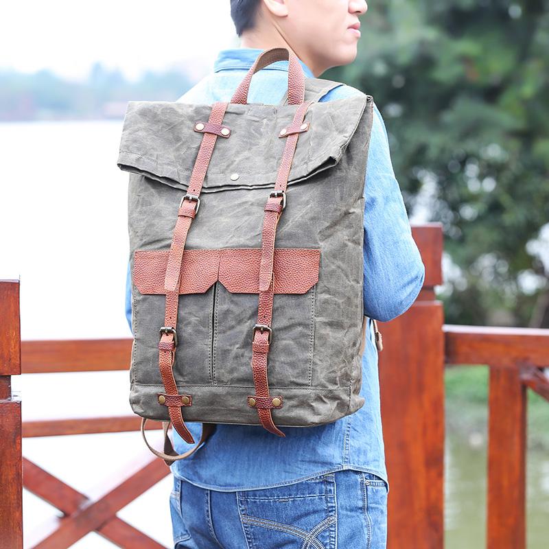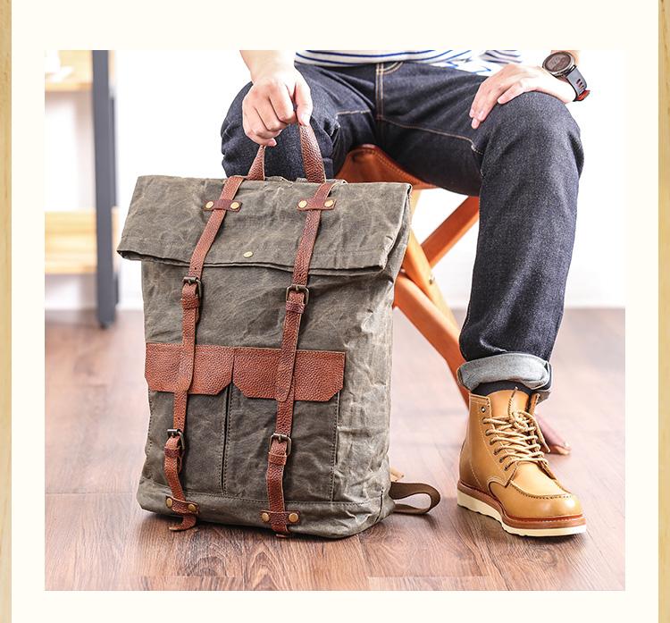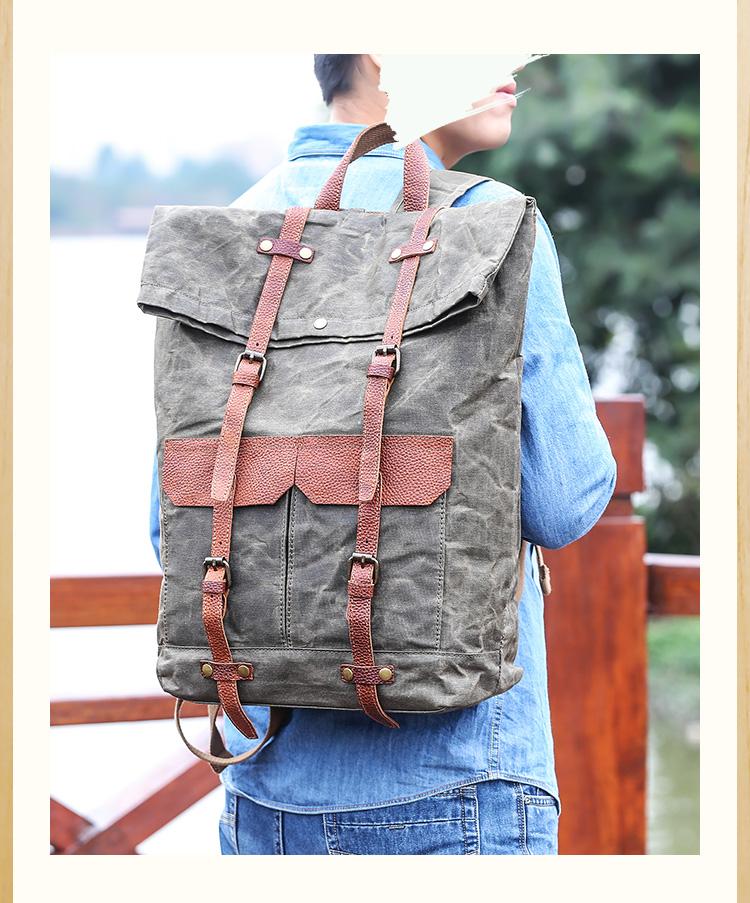 Design: Waxed Canvas Leather Mens Army Green Waterproof Backpack Khaki Travel Backpack Hiking Backpack for Men