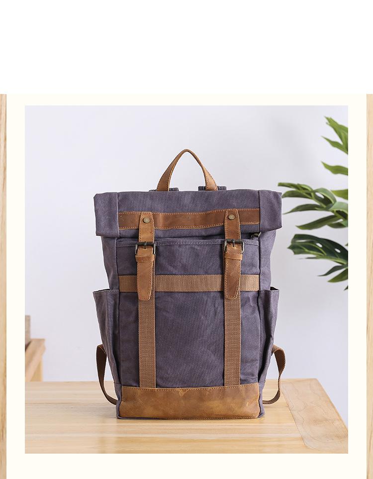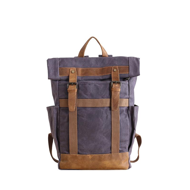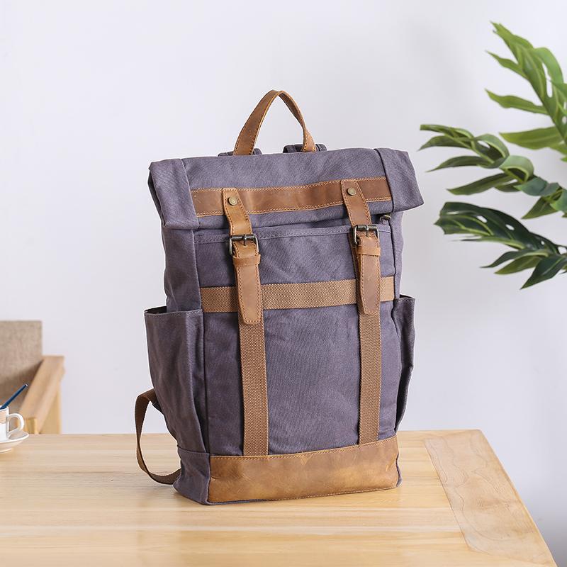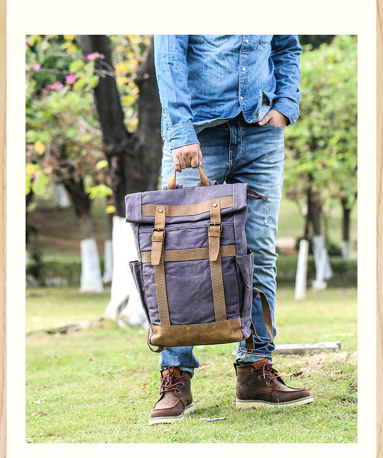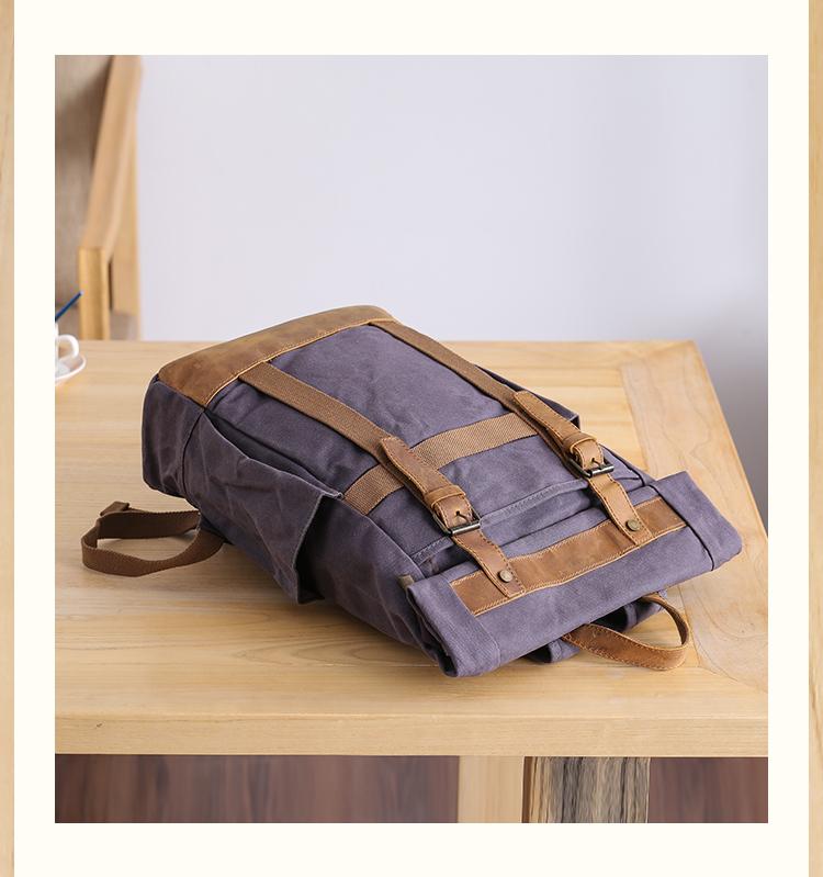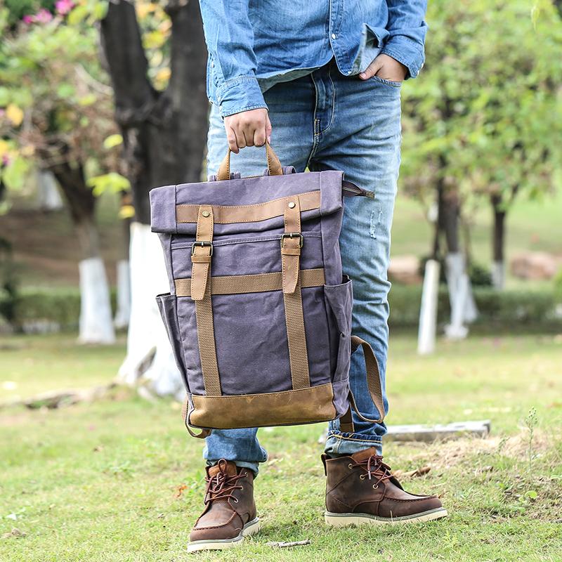 Design: Waxed Canvas Leather Mens Dark Gray College Student Backpack Travel Backpack Hiking Backpack for Men