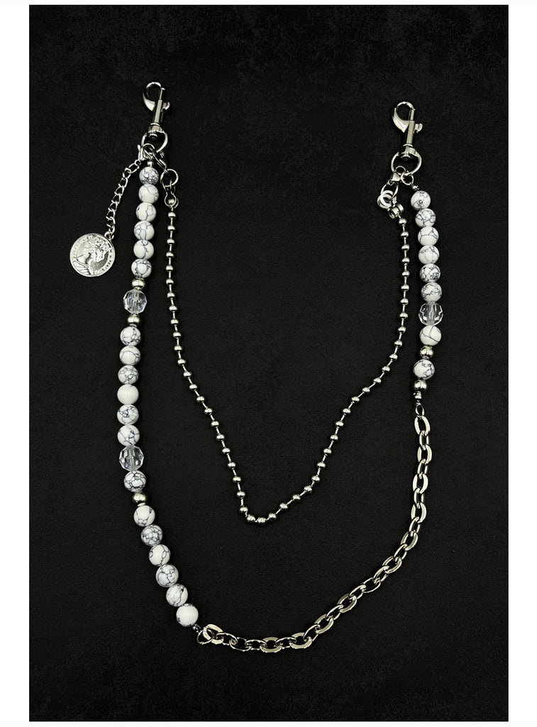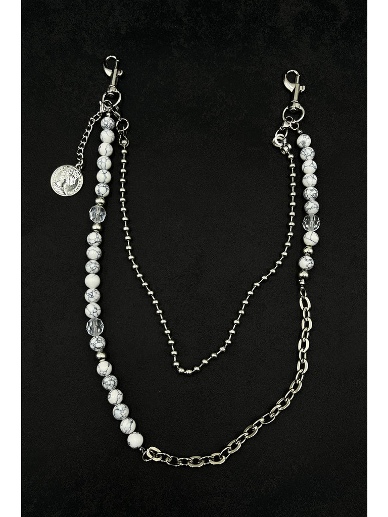 Introducing a refined fusion of ethereal elegance and urban edge with our Beaded Wallet Chain, a meticulously designed accessory that creates a statement through its luminous textures and layered dimensions. This unique Double Wallet Chain features a striking 65cm outer strand composed of genuine white striped turquoise beads, alloy chain links, and sparkling crystal accents, artfully arranged in an asymmetrical, mixed-material composition. Paired with a sleek 40cm inner strand of fine alloy beads, this versatile Ball Wallet Chain creates a captivating visual dialogue between luminous organic stones, industrial metal, and delicate sparkle. The design is elevated with a distinctive circular coin charm near the clasp, adding a final touch of symbolic depth and vintage character.