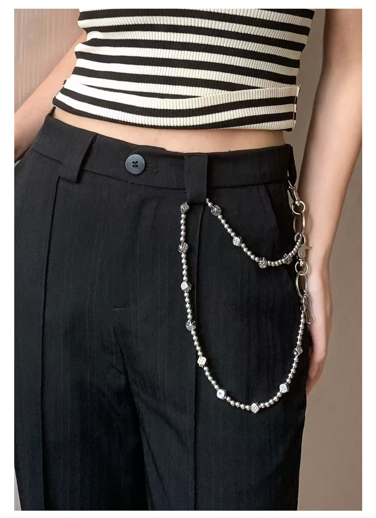 The Beaded Wallet Chain is more than an accessory—it’s a wearable expression of modern style. The alternating dice charms offer a playful nod to chance and luck, while the polished beads provide a sleek, streamlined foundation. Whether worn as a waist chain, layered with other pieces, or styled as a standalone statement, this Ball Wallet Chain delivers a look that’s both refined and rebellious.