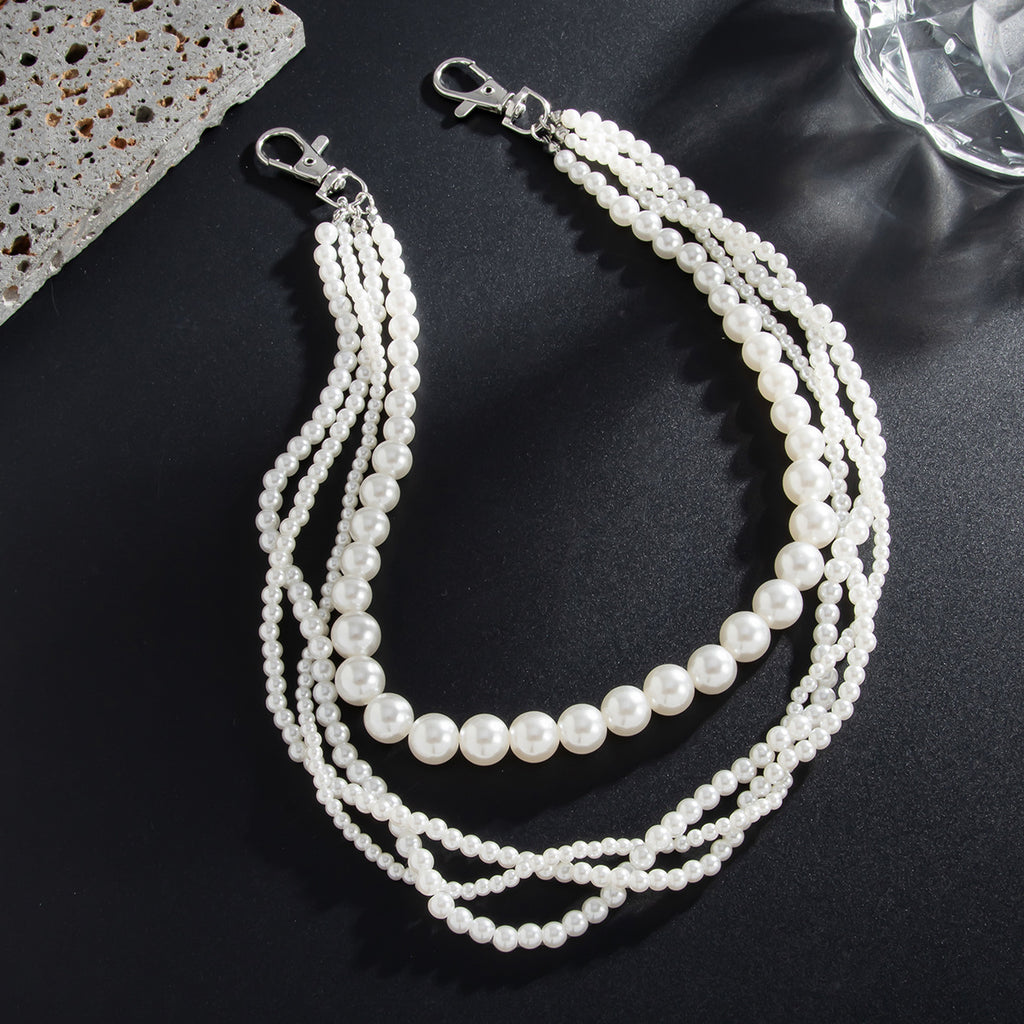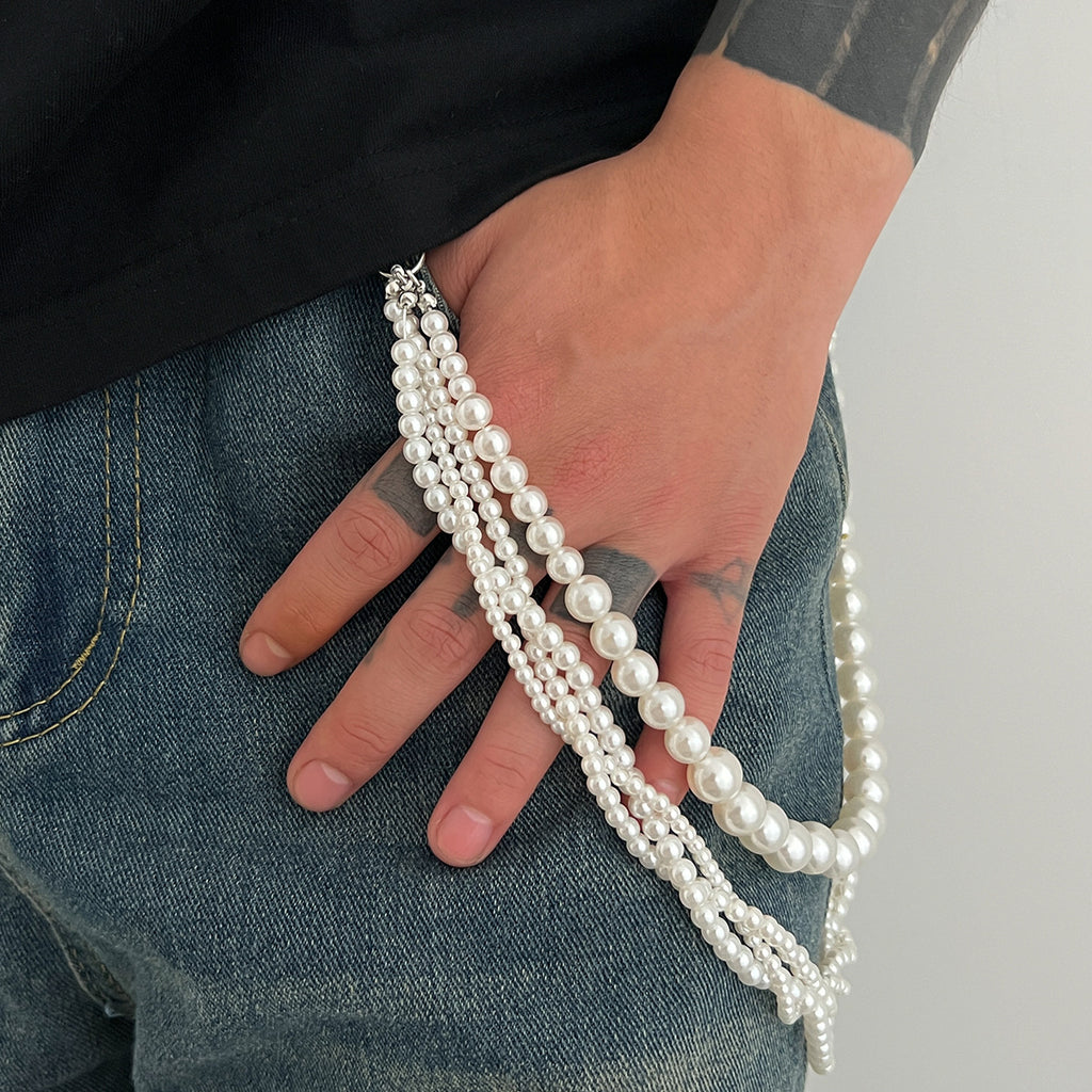 Introduce a bold and textured statement to your wardrobe with the Pearl Wallet Chain, a meticulously crafted accessory that celebrates the art of layering. This unique Ball Wallet Chain features four interwoven strands of faux pearls: one 48cm strand of larger statement pearls paired with three 56cm strands of smaller pearls, all intricately twisted together to create a voluminous, eye-catching look. From a distance, the design flows with a unified pearlescent glow, but a closer look reveals the dynamic contrast in bead sizes and the carefully entangled construction—a detail that adds depth, movement, and a handcrafted feel. This versatile Beaded Pants Chain is designed for those who love to mix softness with structure, offering a look that transitions effortlessly from subculture grit to everyday elegance.
