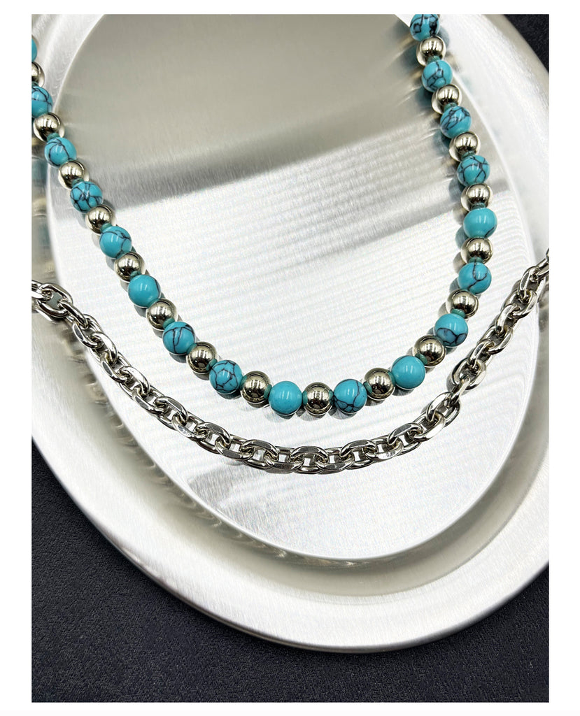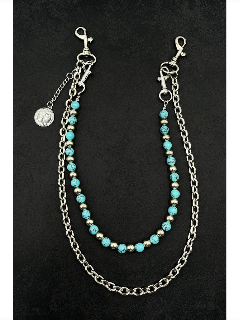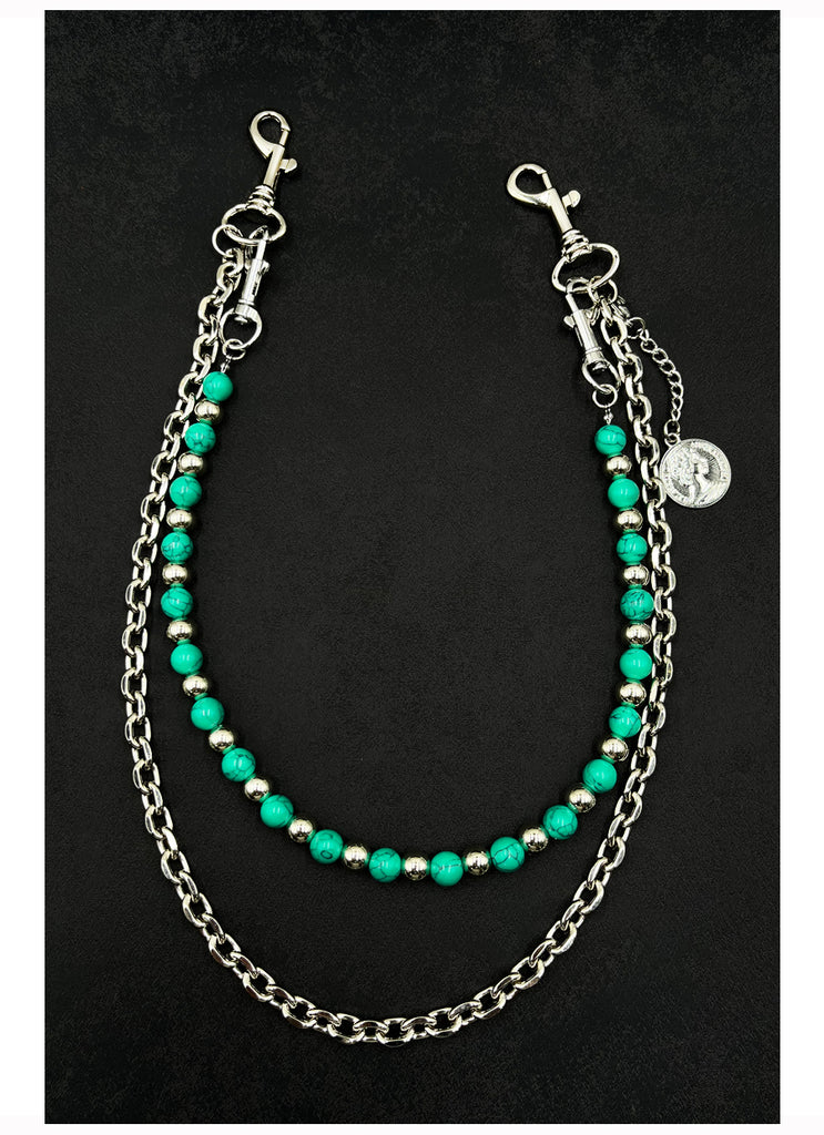 Crafted for the style innovator who values both flexibility and statement-making design, this versatile Double Wallet Chain celebrates the harmony of industrial strength and vibrant natural beauty. The rugged alloy chain provides a strong, architectural foundation, while the red turquoise strand introduces passionate, earthy energy. Whether worn separately for a subtle accent or layered together for maximum impact, this piece adapts to your mood, outfit, and occasion with effortless versatility.