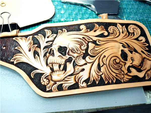 A handmade leather tooled skull small biker wallet is a unique and stylish accessory designed to cater to the needs of bikers and those with an appreciation for cool, edgy fashion. Measuring 10cm x 11.5cm x 3.5cm, this compact wallet is the perfect size for everyday use, combining functionality with a striking design.