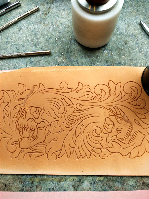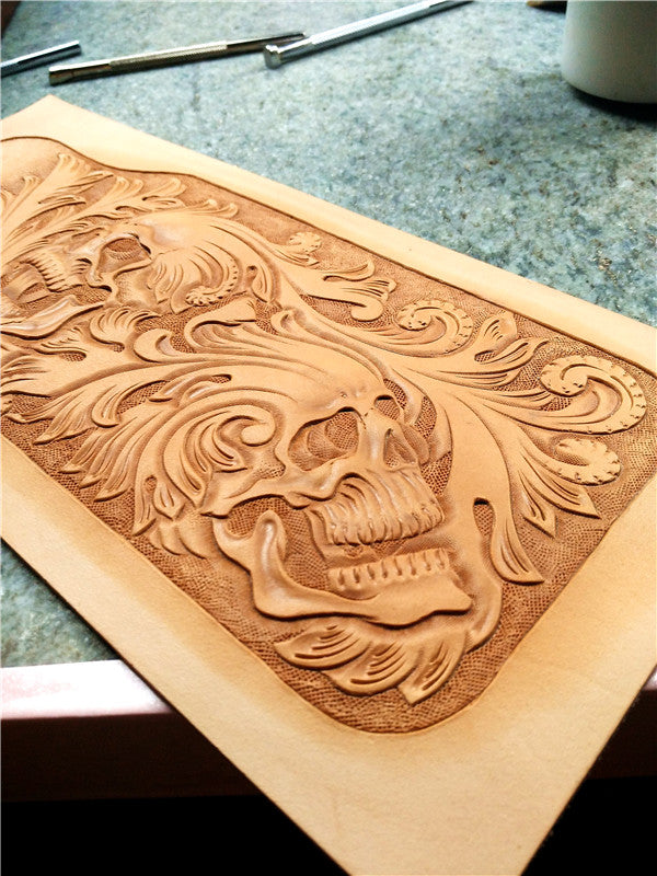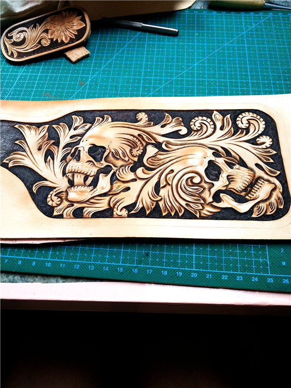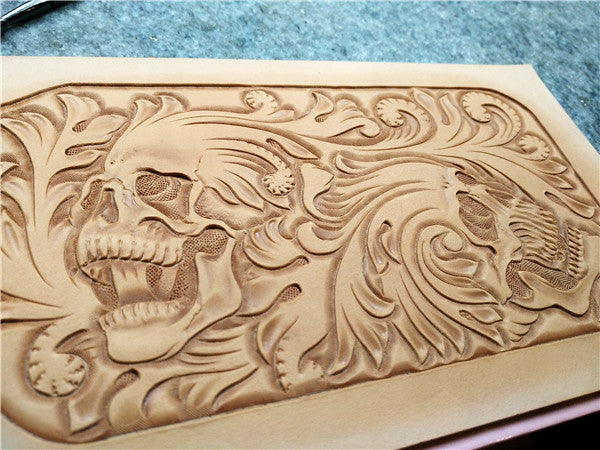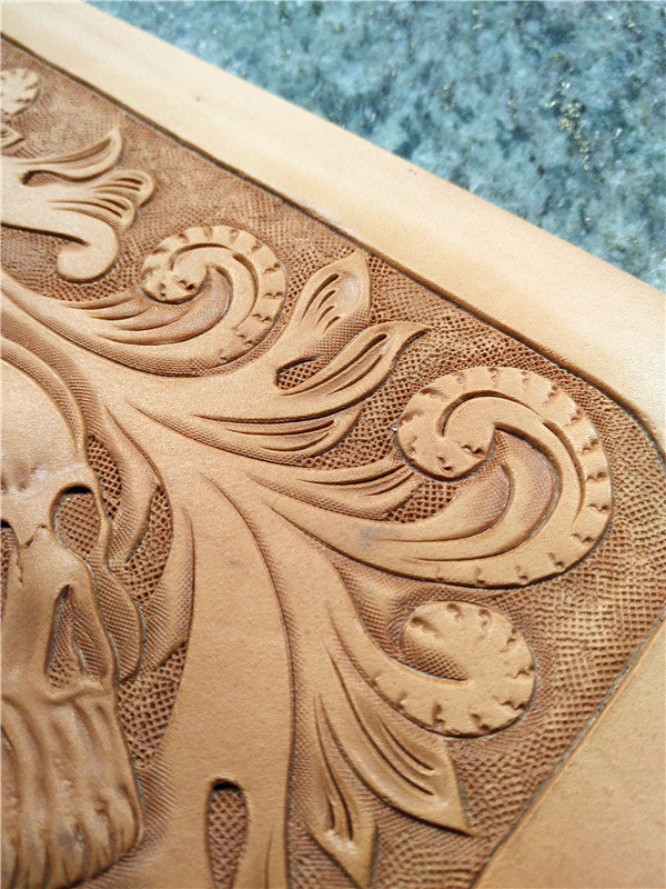 Crafted from high-quality leather, this wallet is both durable and visually appealing. The standout feature of this wallet is its intricate tooling, showcasing a skull and flowers design. The skull motif, a popular symbol in biker culture, represents strength, rebellion, and freedom, while the flowers add a contrasting touch of beauty and elegance. This unique combination makes the wallet not only a practical accessory but also a piece of art that reflects the owner’s personality and style.