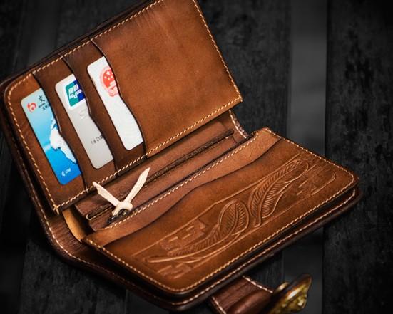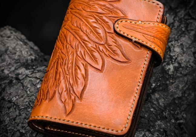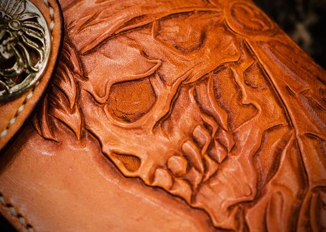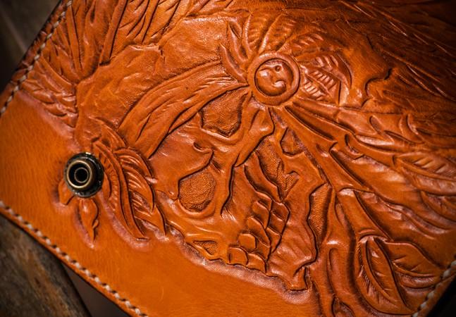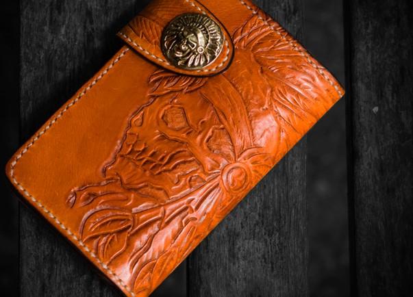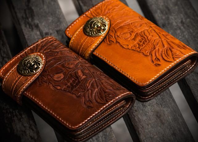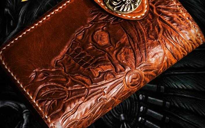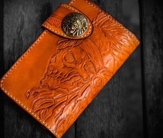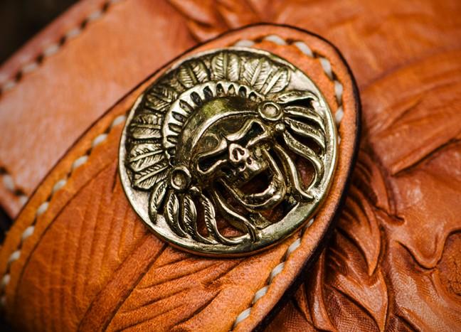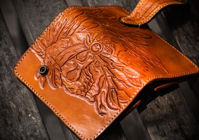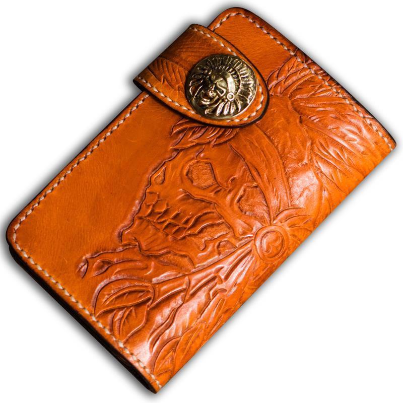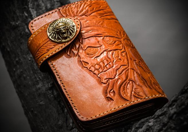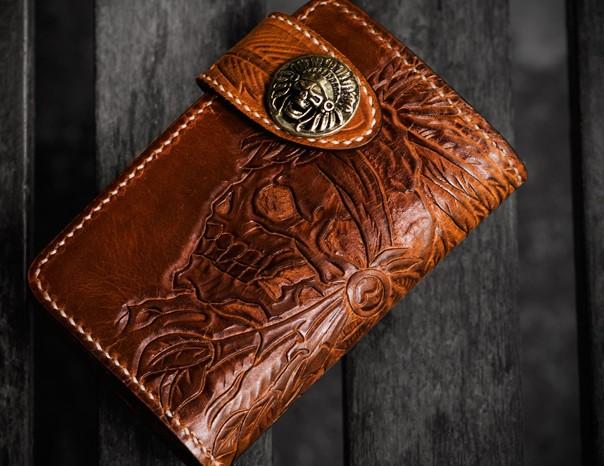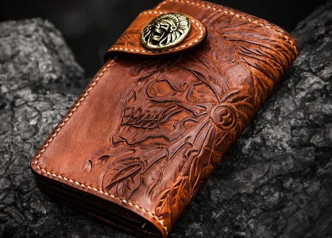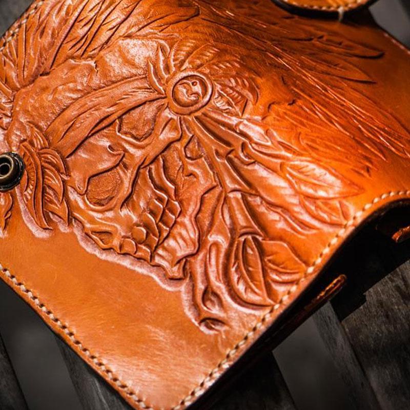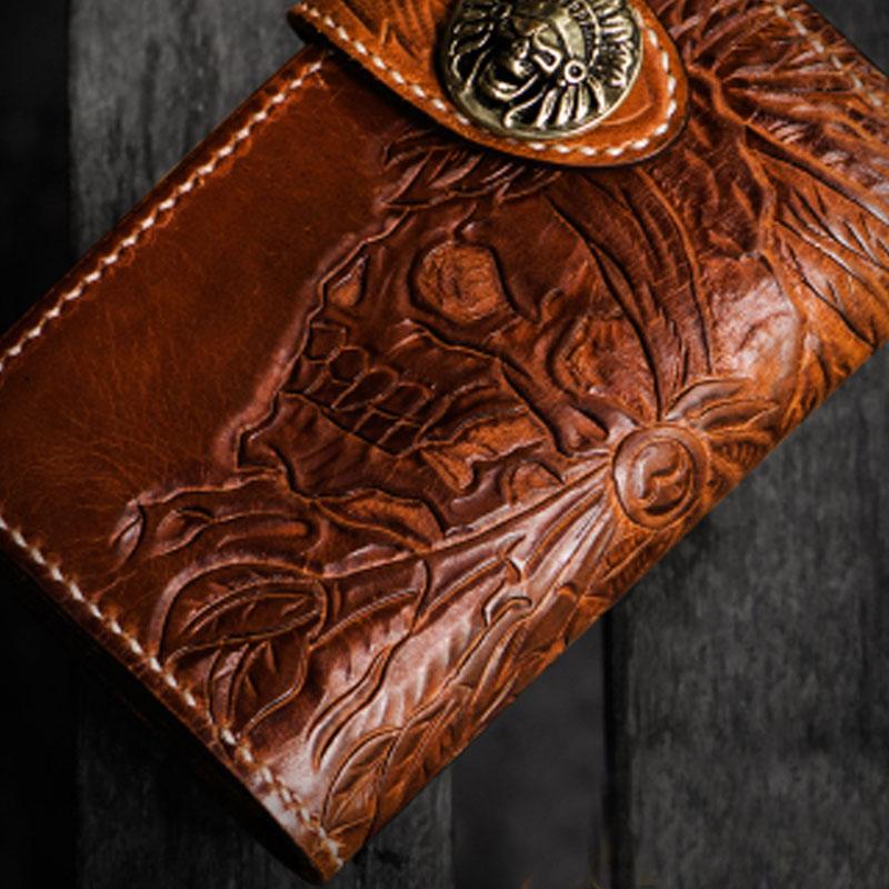 Design: Handmade Leather Tooled Skull Indian Chief Biker Wallet Mens Cool billfold Chain Wallet Trucker Wallet with Chain