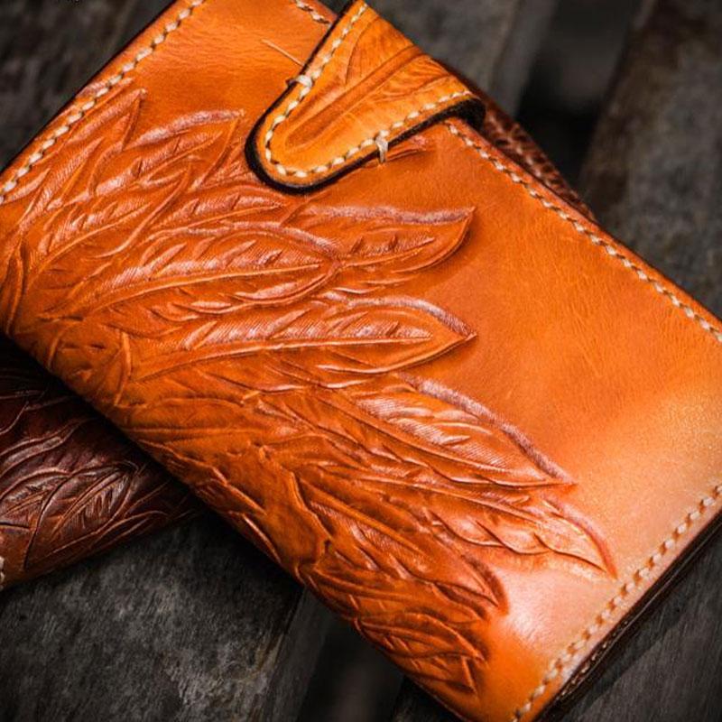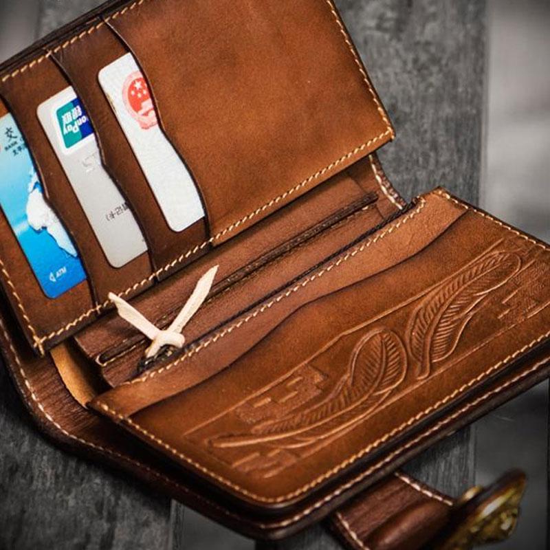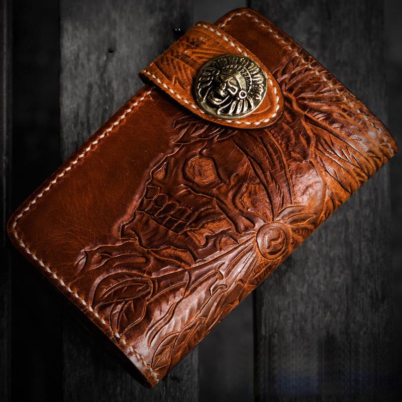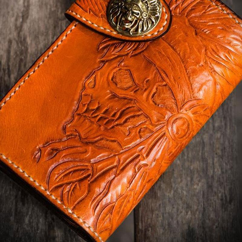 Style: Handmade Leather Tooled Skull Indian Chief Biker Wallet Mens Cool billfold Chain Wallet Trucker Wallet with Chain