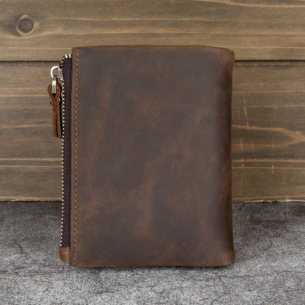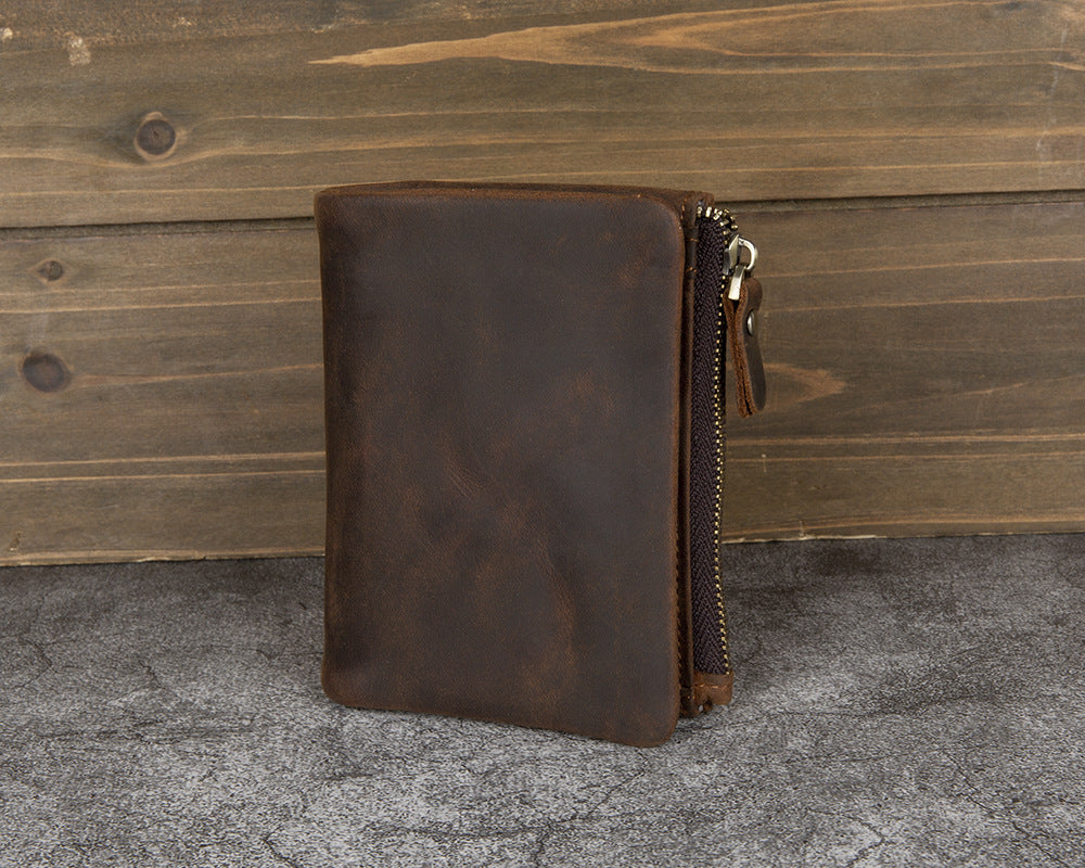 Introducing the perfect blend of compact design and maximum functionality - our Men's Wallet with Coin Purse Billfold. Crafted from genuine full-grain crazy horse leather in a rich dark brown hue, this vertical Billfold with Coin Pocket measures 12.5cm x 9.5cm x 1.5cm, offering surprising storage capacity in a sleek, portable form factor. This versatile Men's Wallet with Coin Purse Billfold combines practical organization with timeless vintage aesthetics.
