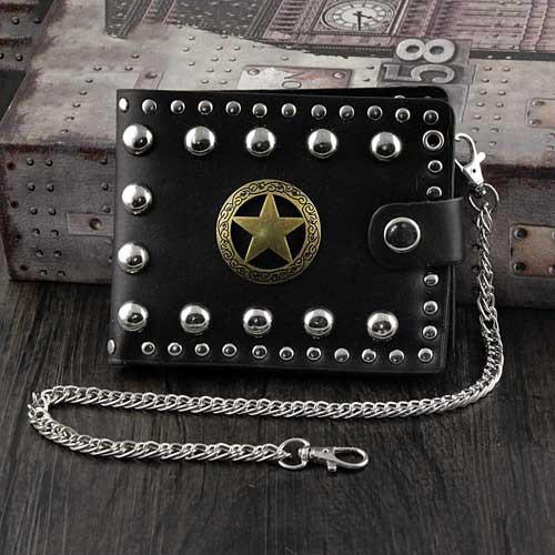 Style: Punk Black Leather Men's Small Biker Wallet Chain Wallet Golden Star Short Wallet with Chain For Men