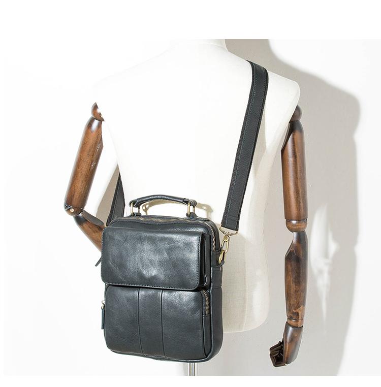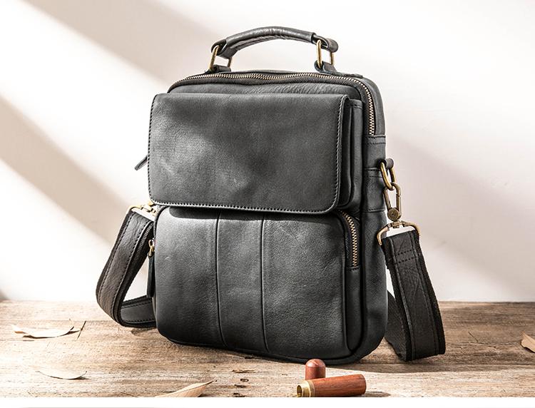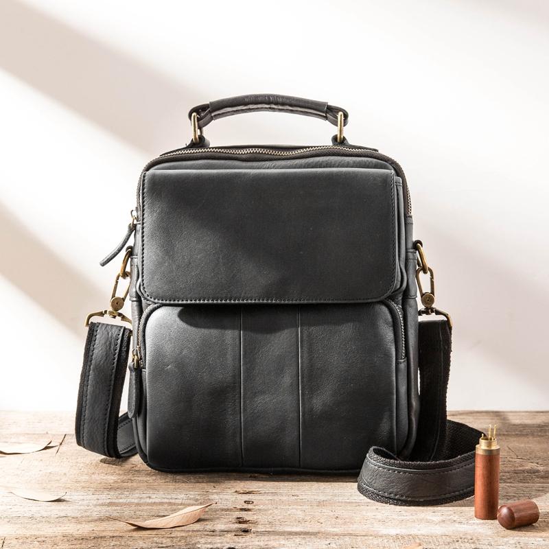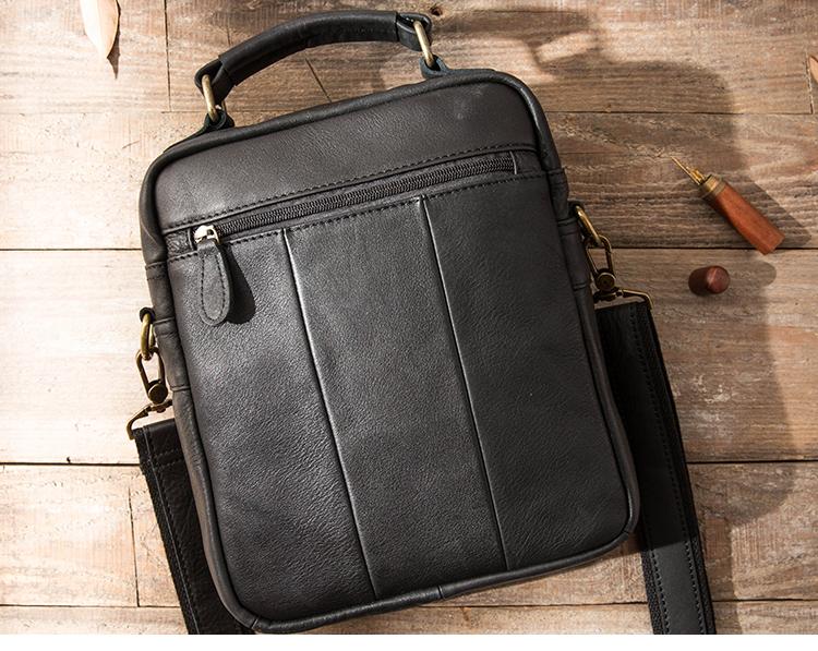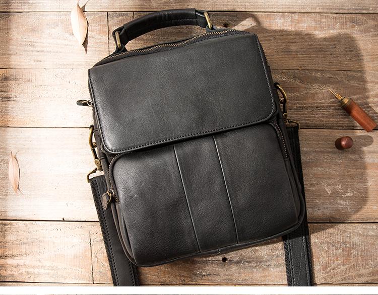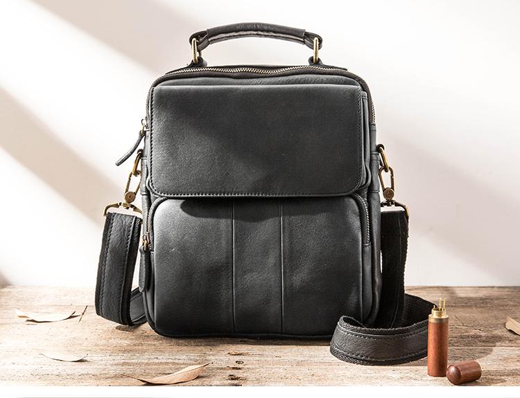 Black Leather Mens Vertical Small Briefcase Work Handbag Side Bag Business Shoulder Bag for Men