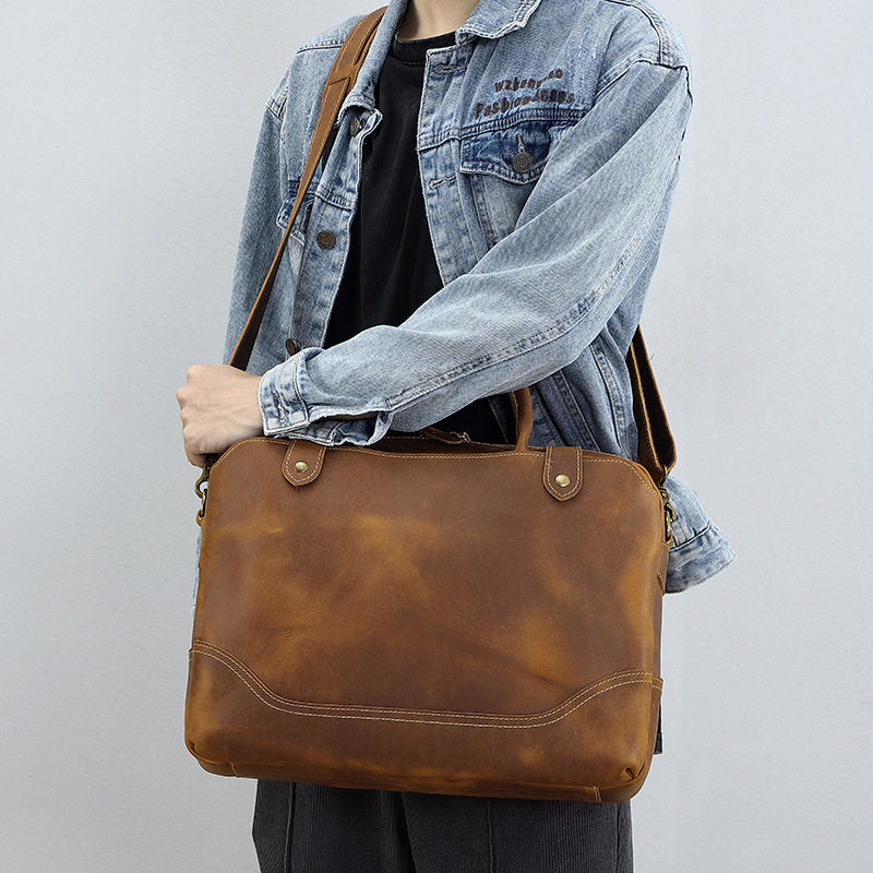 Introducing the 15 Inch Leather Laptop Bag, a timeless and functional companion designed for the modern professional. Expertly crafted from rugged full-grain crazy horse leather, this spacious and stylish 15 inch Laptop Shoulder Bag measures 38cm x 30cm x 8cm, offering ample storage without compromising on sleek design. Weighing just 1.5kg, it balances durability with everyday comfort, making it the ideal computer bag for 15 inch laptop users who value both aesthetics and organization.