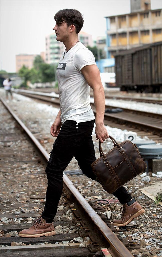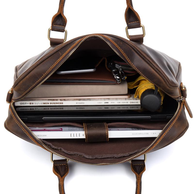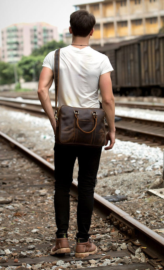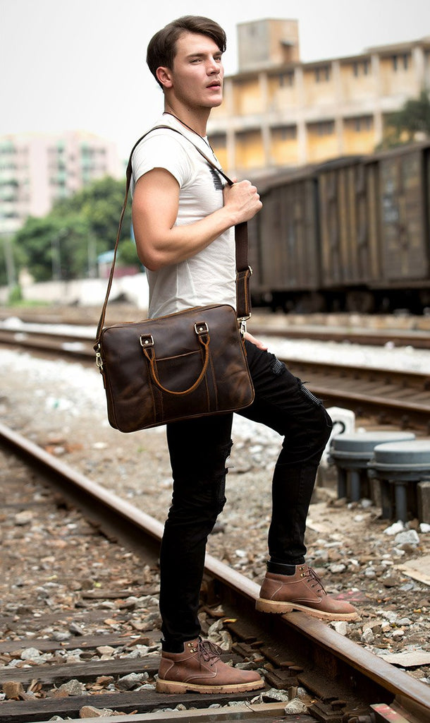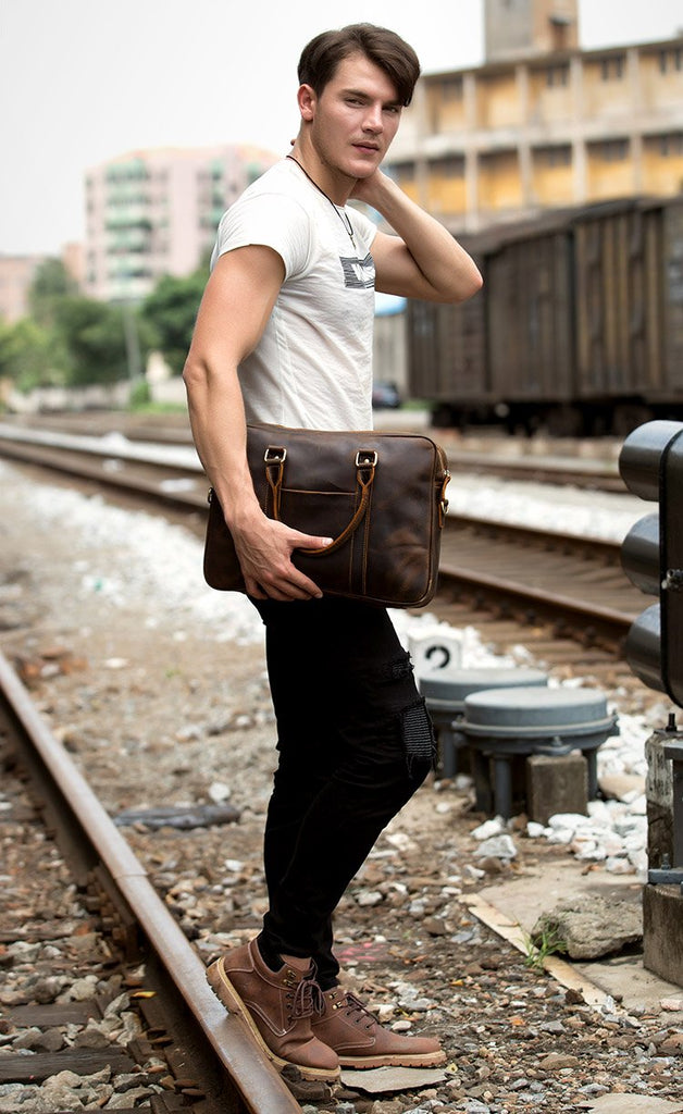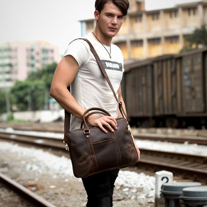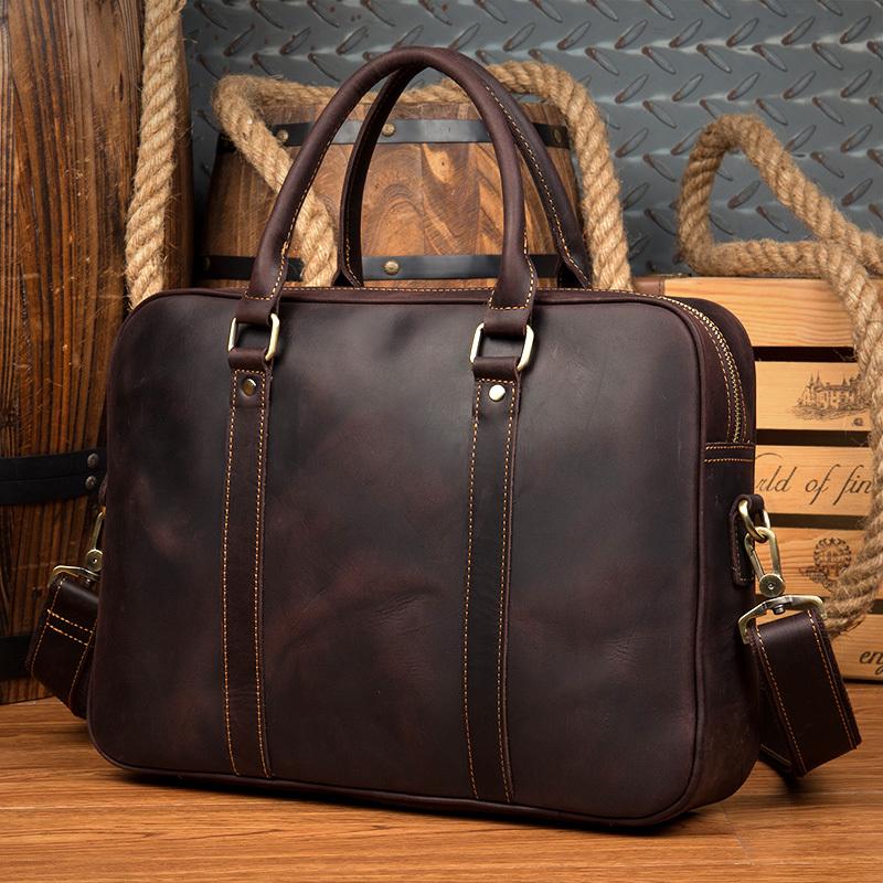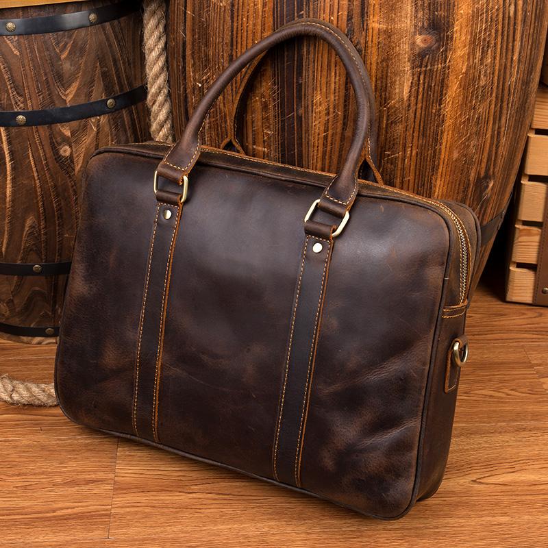 Style: Brown Leather Mens 14 inches Briefcase Laptop Bag Navy Business Bags Work Bag for Men