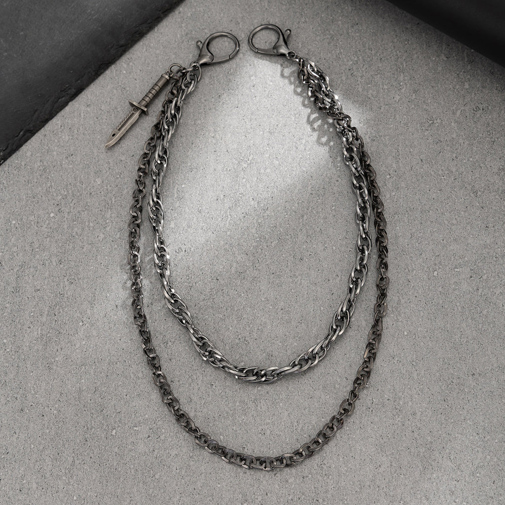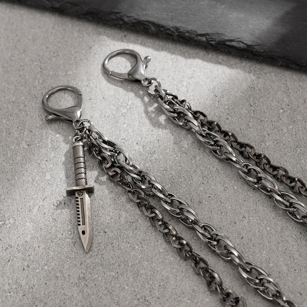 Introducing the Double Wallet Chain, a bold and unapologetic accessory that blends industrial toughness with striking detail. This standout Cool Wallet Chain is composed of two distinct iron-black metal chains, each crafted for a rugged, substantial feel that exudes strength and attitude. Hanging near the belt loop attachment is a detailed dagger pendant, adding a sharp, symbolic focal point to the layered design. Built for those who wear their edge with confidence, this chain is a tribute to raw style, subculture pride, and fearless self-expression.