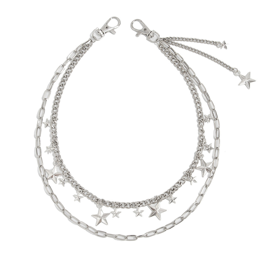 From a distance, the chain presents a cohesive, metallic drape, but a closer look reveals the delicate star charms of different sizes and the clean contrast between the two chains. The fine star-adorned strand offers a personalized, celestial touch, while the plain alloy chain provides structure and balance. Lightweight and comfortable for all-day wear, this chain transitions effortlessly from punk concerts and motorcycle gatherings to smart-casual outings and everyday streetwear. Whether you're expressing individuality, embracing alternative fashion, or simply elevating your daily look, it delivers a curated touch of attitude and artistry.
