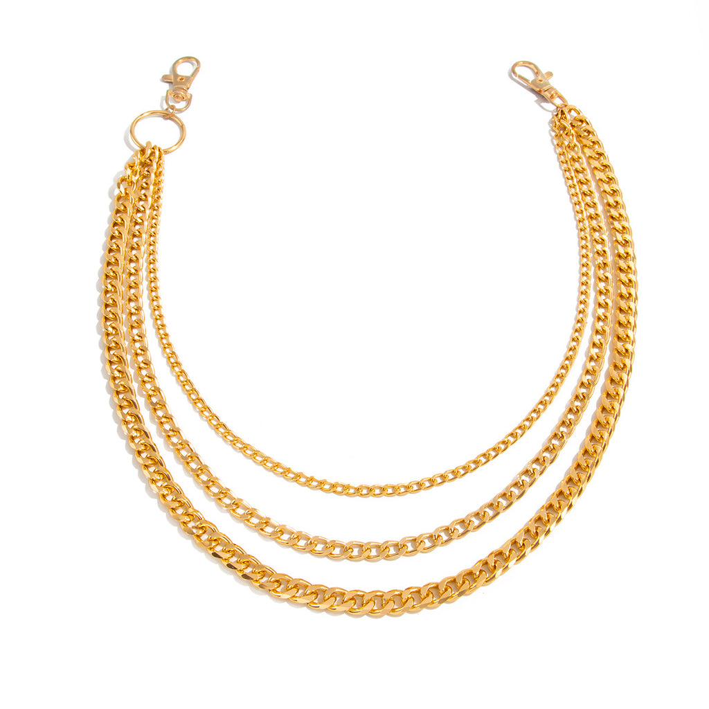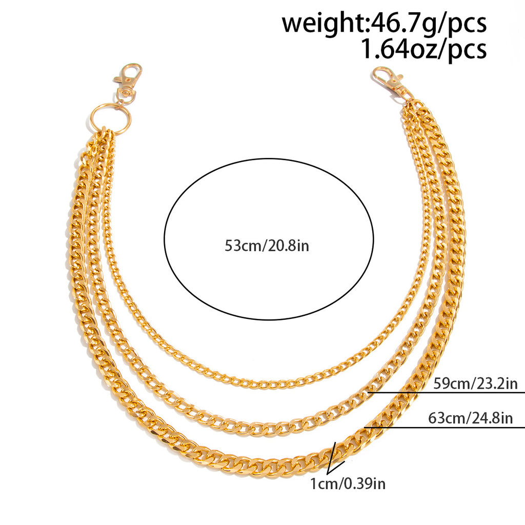 Introduce a bold, layered statement to your look with the 3 Chains Pants Chain, a versatile triple-strand design that balances precision with raw attitude. This unique Triple Wallet Chain features three distinct lengths—63cm, 59cm, and 53cm—each crafted from high-quality alloy and available in two classic finishes: Luxury Gold and Sleek Silver. The graduated lengths create a cascading, tiered effect that adds dimension and movement, making it a standout piece for those who appreciate structured styling and subculture edge. This adaptable Women Wallet Chain is designed to transcend gender and occasion, offering a wearable expression of confidence, rebellion, and everyday cool.