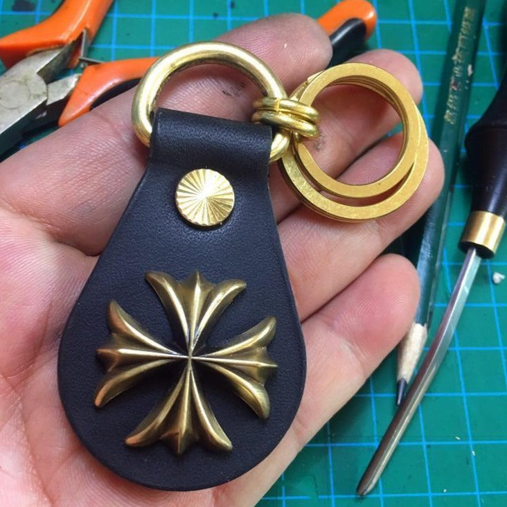 Design: Black Biker Leather Brass Keyring Moto KeyChain Iron Cross Leather Keyring Moto Cross Key Holders Key Chain Key Ring for Men