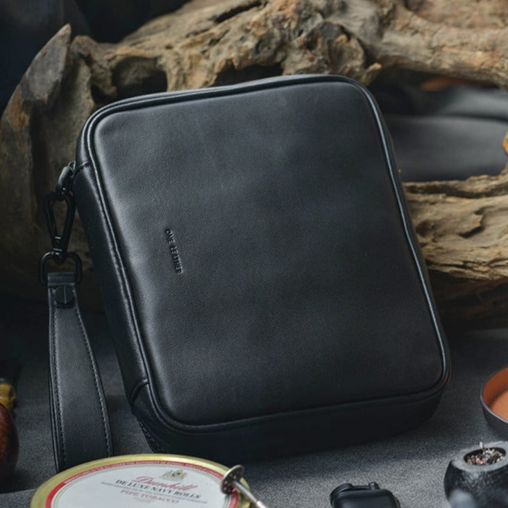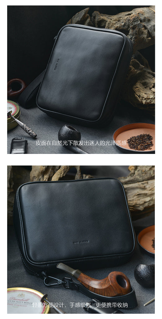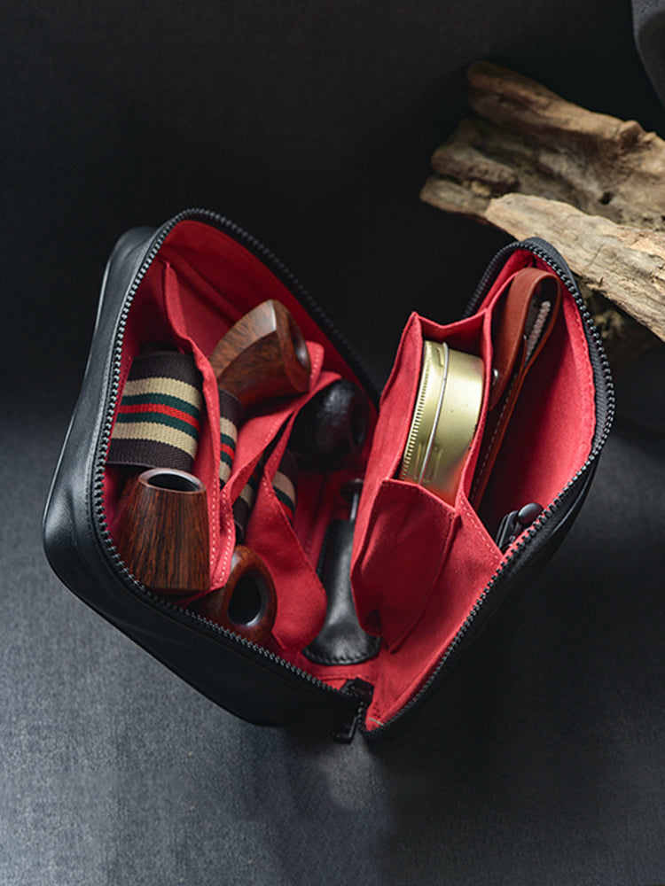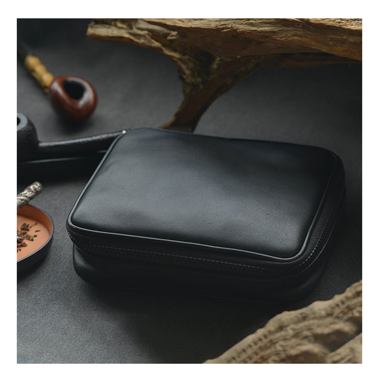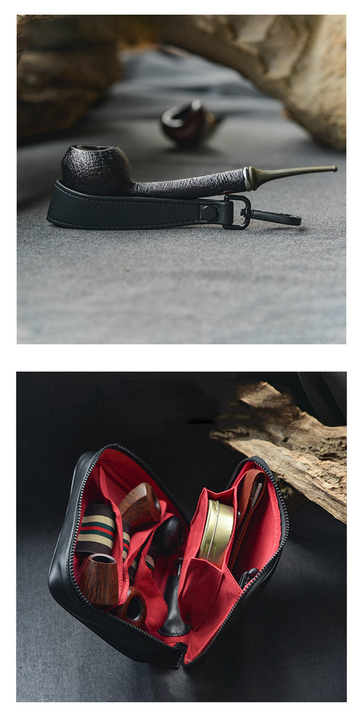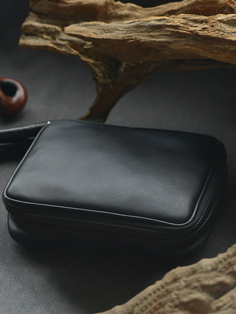 Style: Cool Leather Black Mens Leather 4pcs Tobacco Pipe Case Zipper Tobacco Pipe Case for Men