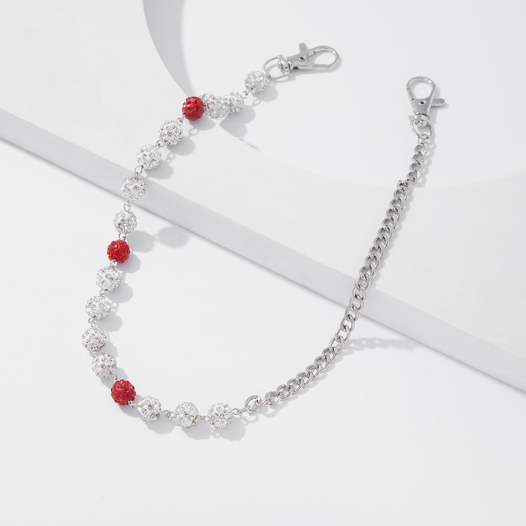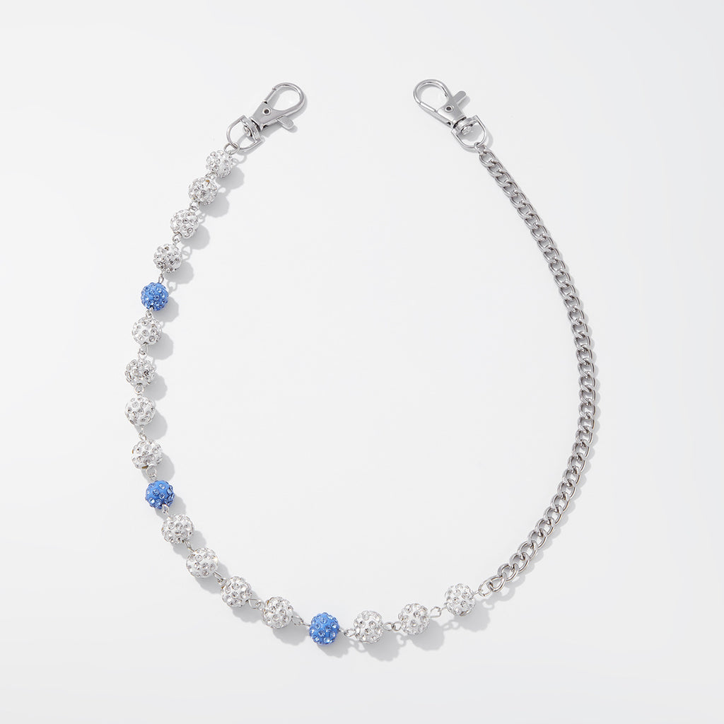 Introduce a bold and brilliant statement to your waistline with the Blue Pants Chain, a uniquely designed accessory that blends industrial edge with dazzling color. This standout Beaded Pants Chain measures 52.5cm and is crafted in gleaming silver alloy, featuring a dual-part design: one half is a textured alloy chain, while the other half is composed of spherical beads, most of which are set with clear cubic zirconia stones. The defining accent comes from three strategically placed light blue CZ beads, which add a subtle yet striking pop of color. This versatile Diamond Pants Chain is designed for those who appreciate contrast, sparkle, and subculture style, making it a standout piece for a wide range of aesthetics and occasions.